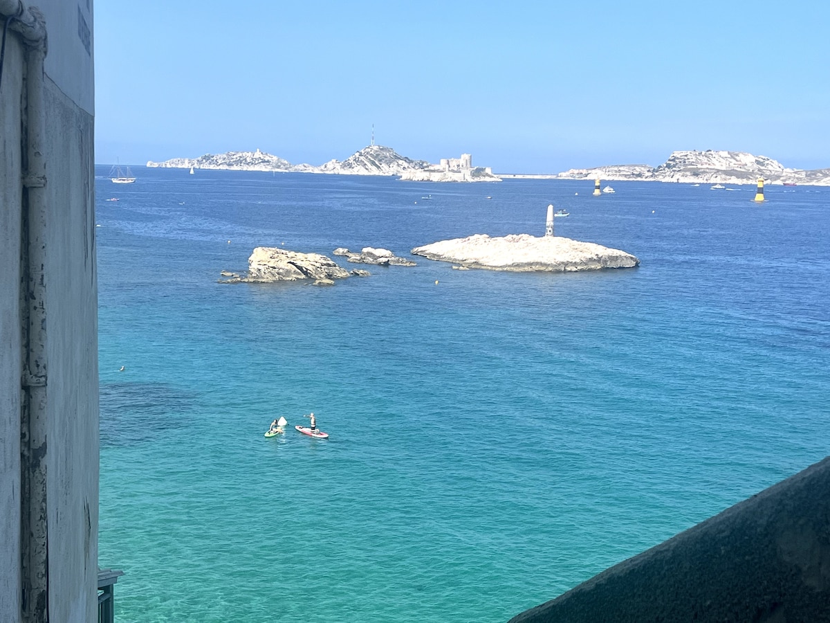 Un apartamento luminoso con vistas panorámicas al mar desde cada habitación. ¡Disfrutarás de impresionantes puestas de sol desde su gran terraza, te relajarás en el hamac y disfrutarás de la vista! Convenientemente ubicado en el corazón de Endoume, uno de los mejores vecindarios de Marsella, ¡estás a solo 2 minutos a pie del mar! Aire acondicionado + wifi rápido y confiable.