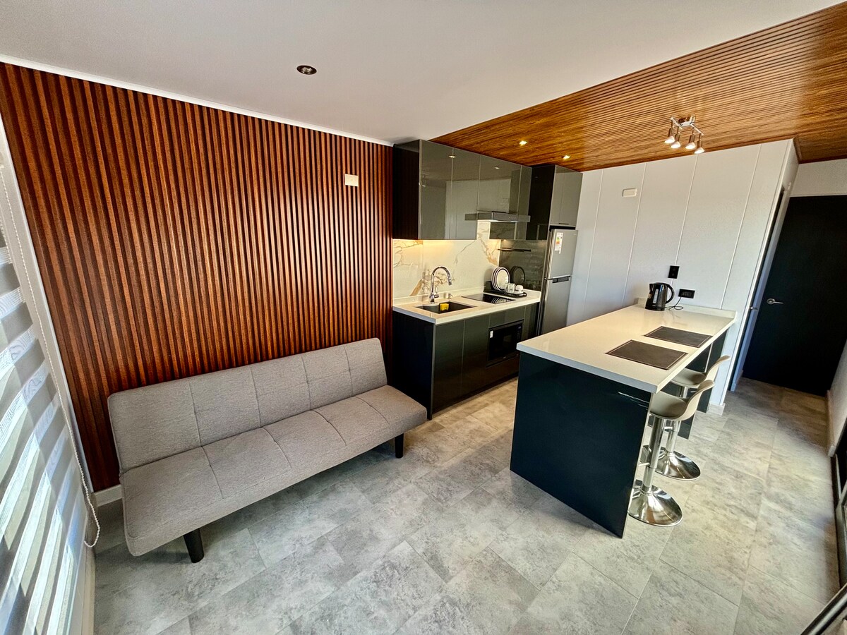 Disfruta de una experiencia con estilo en este alojamiento céntrico en la Comuna de Cartagena. A solo 5 min de la playa, espacio muy comodo para pareja, cocina moderna full equipada, las luces se controlan desde el celular. Estacionamiento para 2 Vehículos. Sector muy tranquilo dentro de un condominio privado. Cercano a restaurantes y supermercados. Inspírate a disfrutar de una experiencia inolvidable.
