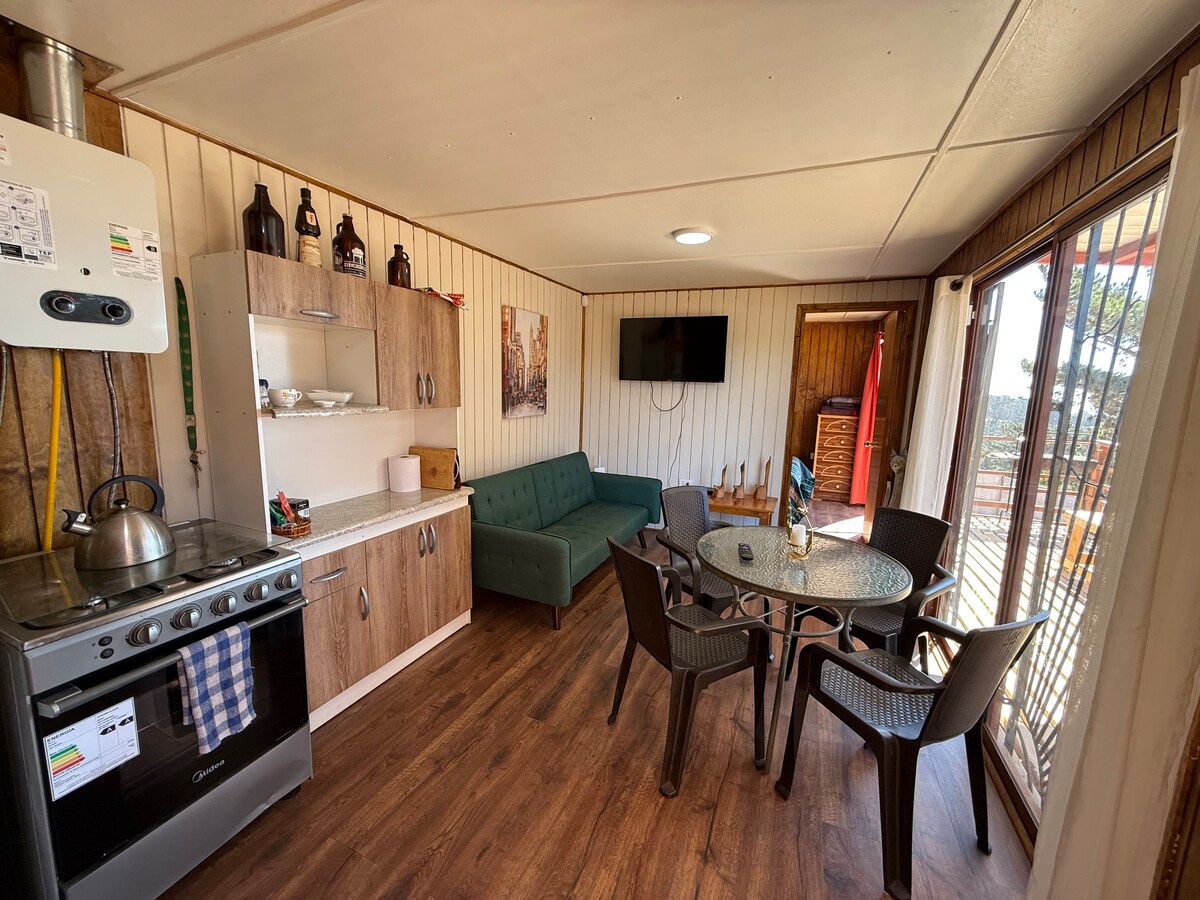 Disfruta de los sonidos de la naturaleza cuando te quedes en este lugar único. El espacio es especial para desconectarte de la rutina y conectar con la naturaleza, por las mañanas te visitarán variedad de aves y por las noches los conejitos salen a jugar. Casa en contenedor cuenta con dos dormitorios equipados con cama de calidad DRIMKIP. Quincho, fogón, tinaja privada de agua caliente al aire libre y gran terraza. El costo de la leña viene incluido para dos dias en la tarifa de aseo.