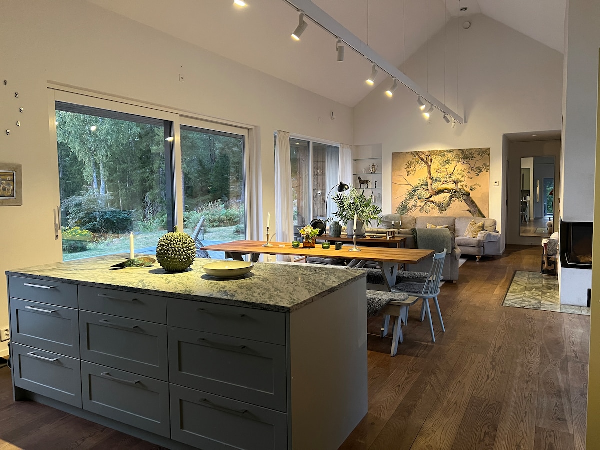 Villa tranquila en el bosque con vistas al lago, a 25–45 minutos de Estocolmo. En Villa WILHELM, despierta con las copas de los árboles y el agua, camina un minuto hasta el lago o llega al mar en quince. Relájate en el jacuzzi al aire libre, en la sauna o junto a la chimenea interior. Tiene capacidad para 6 personas en tres dormitorios (dormitorio adicional opcional hasta 8, se aplican tarifas). Hay un parque infantil a solo 2 minutos. Terrazas soleadas, noches tranquilas y cielos estrellados. Ideal para familias y amigos que buscan una escapada tranquila y llena de naturaleza con comodidades modernas y un sistema de aire acondicionado.