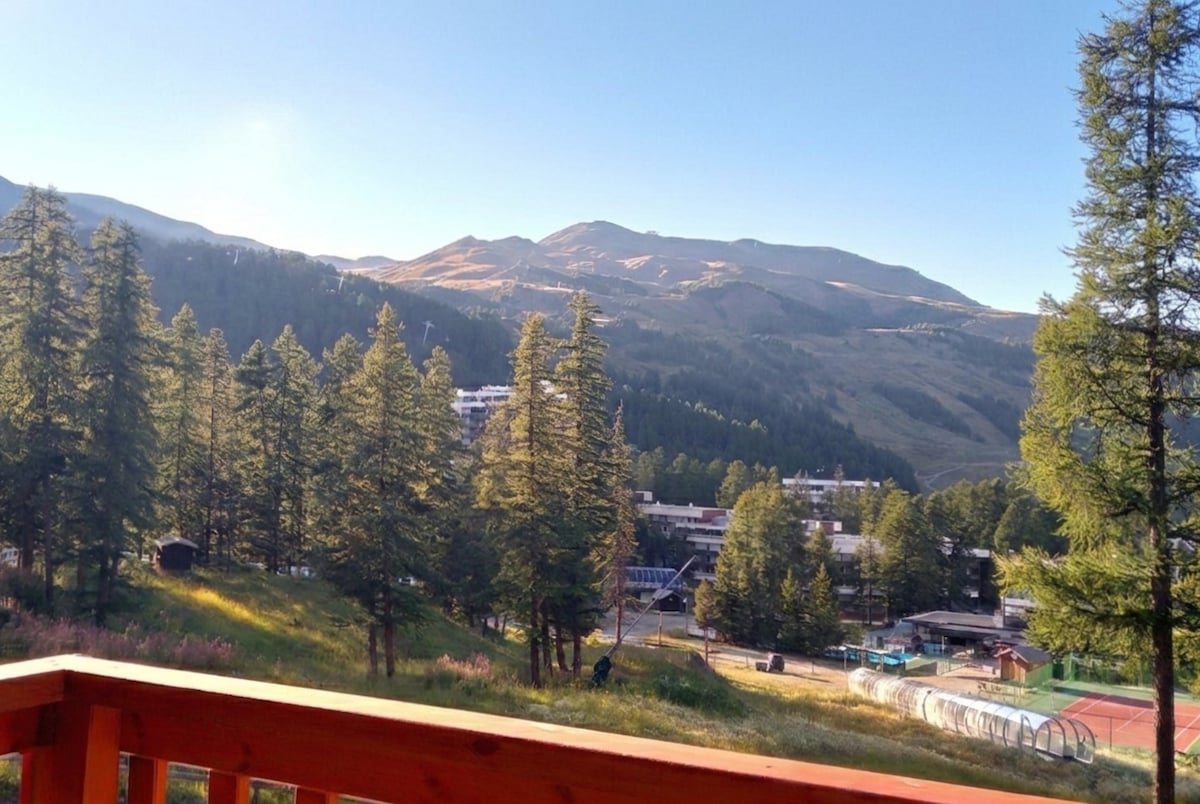 Encantador pequeño estudio de 20 m2, situado al pie de las pistas (50 metros) y de las tiendas con aparcamiento gratuito. Se compone de: - una sala de estar con televisión - una pequeña terraza suspendida en un entorno verde - una zona de montaña cerrada con literas y un pequeño armario - un amplio cuarto de baño con ducha a ras de suelo y WC - un pequeño espacio para cocinar, que consta de un fregadero, un microondas/horno, una pequeña nevera y una placa eléctrica extraíble.