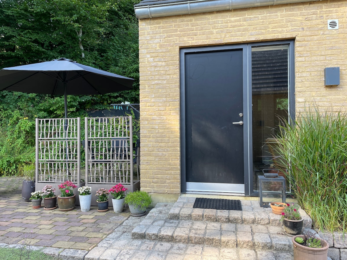 Pequeño y acogedor anexo situado en un gran jardín cerca de la naturaleza. Pista de tenis privada y muchas opciones de juego para niños pequeños y grandes. A 20 minutos de Legoland, Lalandia, Wow Park y el aeropuerto de Billund.