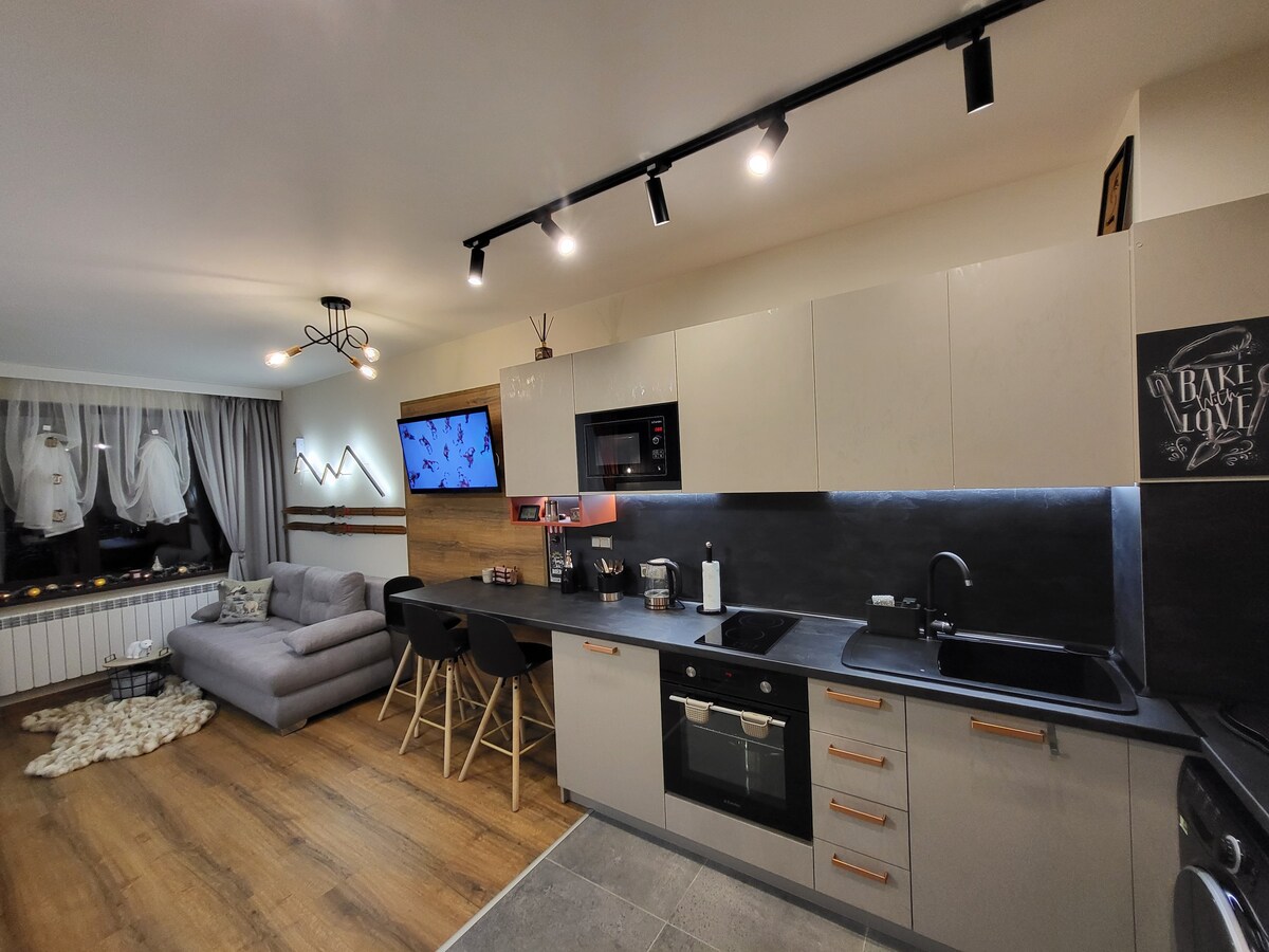El estudio tiene una cama doble (dormitorio 1,60 x 2,00 m), sofá cama (estirado - 1,40 x 1,90 m), cocina americana, baño, terraza con vistas al pinar y a las montañas. La cocina dispone de todos los utensilios y vajilla necesarios. En el territorio del complejo hay aparcamiento gratuito con un número limitado de plazas. A poca distancia a pie se encuentran remontes, pistas, bares y restaurantes.