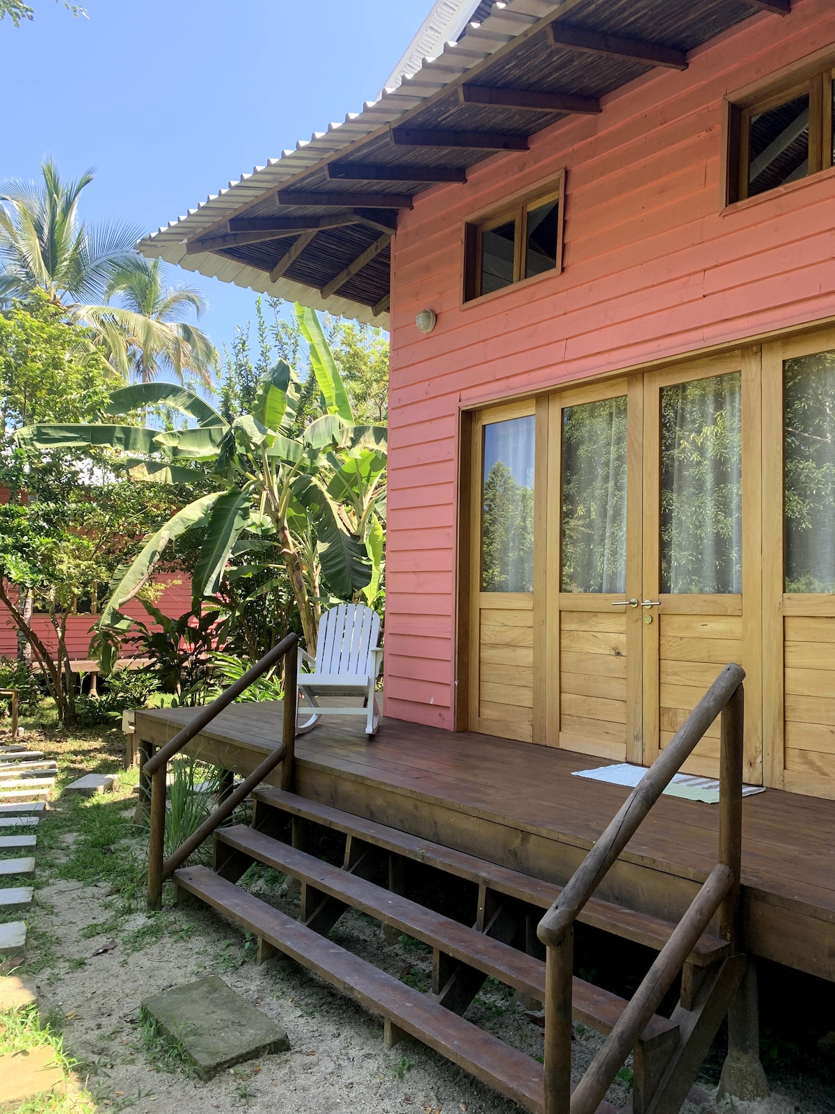 Disfruta de una cabaña fabricada delicadamente en madera entre las montañas y el mar. A su interior podrás ver la combinación perfecta entre su estructura arquitectónica elaborada por maestros carpinteros de la zona, y el mobiliario y menaje seleccionados cuidadosamente para ofrecerte una experiencia de lujo y confort. Podrás apreciar por un lado el verde intenso de nuestro jardin cuidado especialmente para crear un oasis de tranquilidad rodeado de flores y el canto de los pájaritos,