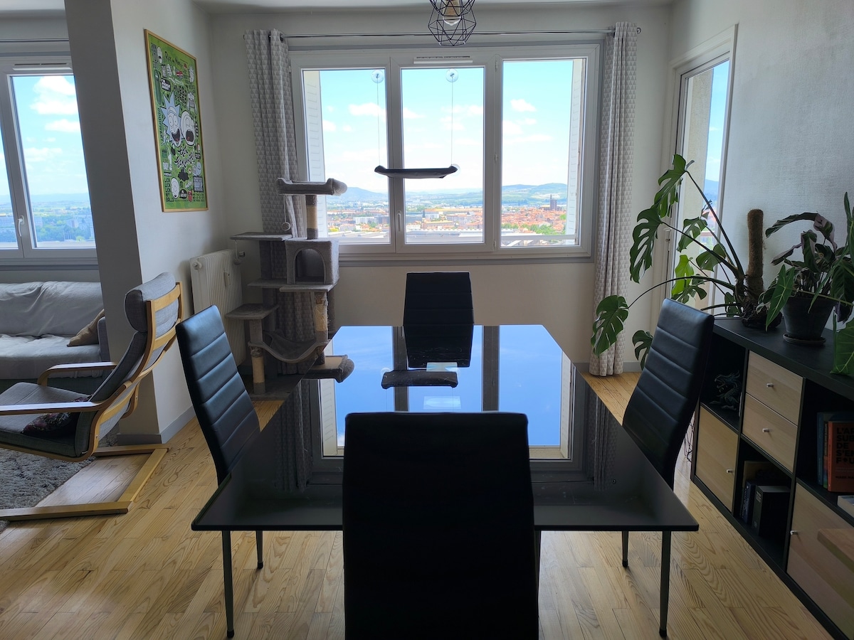 Apartamento de 110m2 totalmente nuevo con dos balcones, terraza y magníficas vistas de la plaza Victor Hugo de Cusset. Se compone de: - dos dormitorios de 15 m2 cada uno - salón con cocina abierta de 50 m2 - Baño de 8m2 - WC de 4 m2 - terraza de 12 m2 Extremadamente tranquilo, ya que es el único apartamento en el nivel. Acceso para personas con movilidad reducida gracias al ascensor. Todos equipados a nivel de la cocina y ropa de cama ¡Netflix, YouTube e Internet disponibles en un televisor de 58 pulgadas!