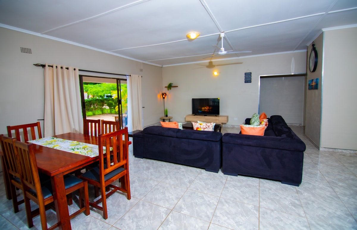 Un magnífico y muy cómodo apartamento de 2 apartamento de 2 dormitorios en una ubicación fabulosa a unos 7 minutos en coche de las mundialmente famosas cataratas Victoria en el lado de Zimbabue. Gran base para explorar la zona con wifi y un entorno tranquilo. Ideal para familias o fiestas grandes. The Couch es uno de los 4 apartamentos que comparten el mismo jardín y piscina.
