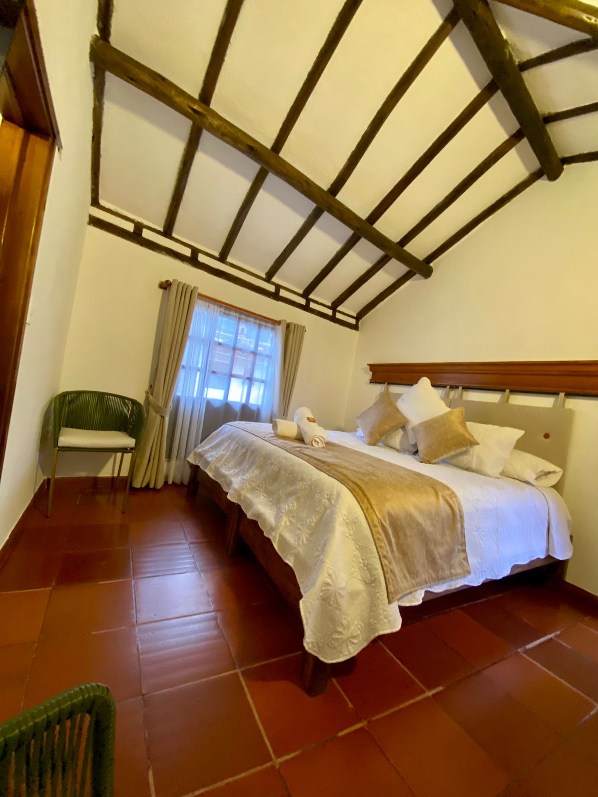 Esta linda habitación se encuentra en Casa Pancha Mama con una excelente ubicación a solo dos cuadras de la plaza principal. Es Ideal para que una pareja pase unos dias romanticos explorando la encantadora Villa de Leyva. Es amplia y acogedora aequipada con una cama doble y un banio completo . La habitacion tiene una hermosa vista al patio de la casa y a las montañas. Un delicioso desayuno esta incuido en el precio de la habitación.