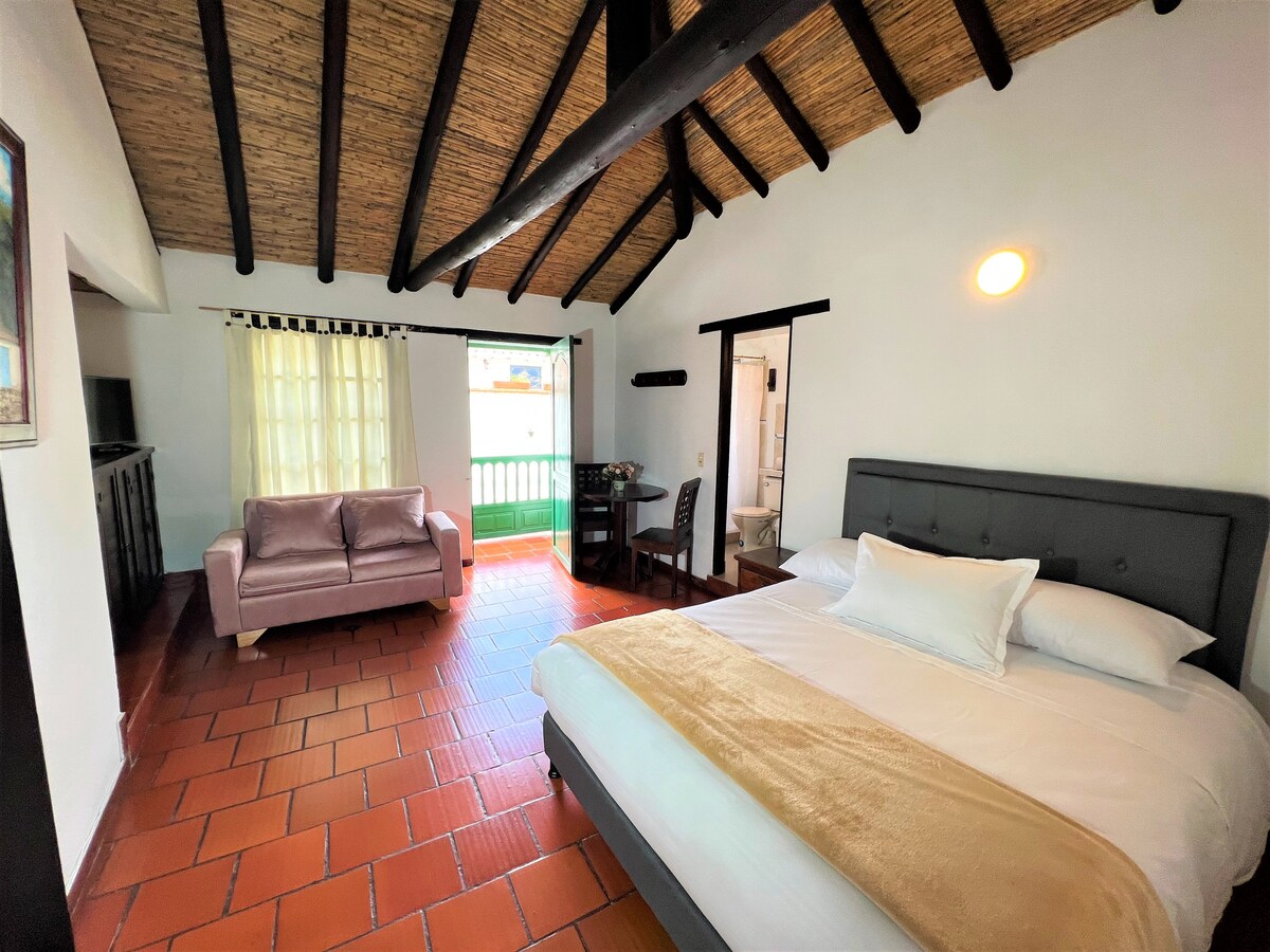 Vive una experiencia única en nuestra Junior Suite en Casa Villa Bonita, un acogedor hotel campestre en Villa de Leyva. Disfruta de la comodidad de una cama doble, televisión, wifi, baño privado y un acogedor sofá para relajarte. Lo mejor de todo es su balcón con una vista espectacular a la montaña, perfecto para desconectarte y disfrutar de la naturaleza. Además, somos pet friendly, para que puedas compartir esta experiencia con tu mascota. ¡Un lugar ideal para el descanso y la tranquilidad.