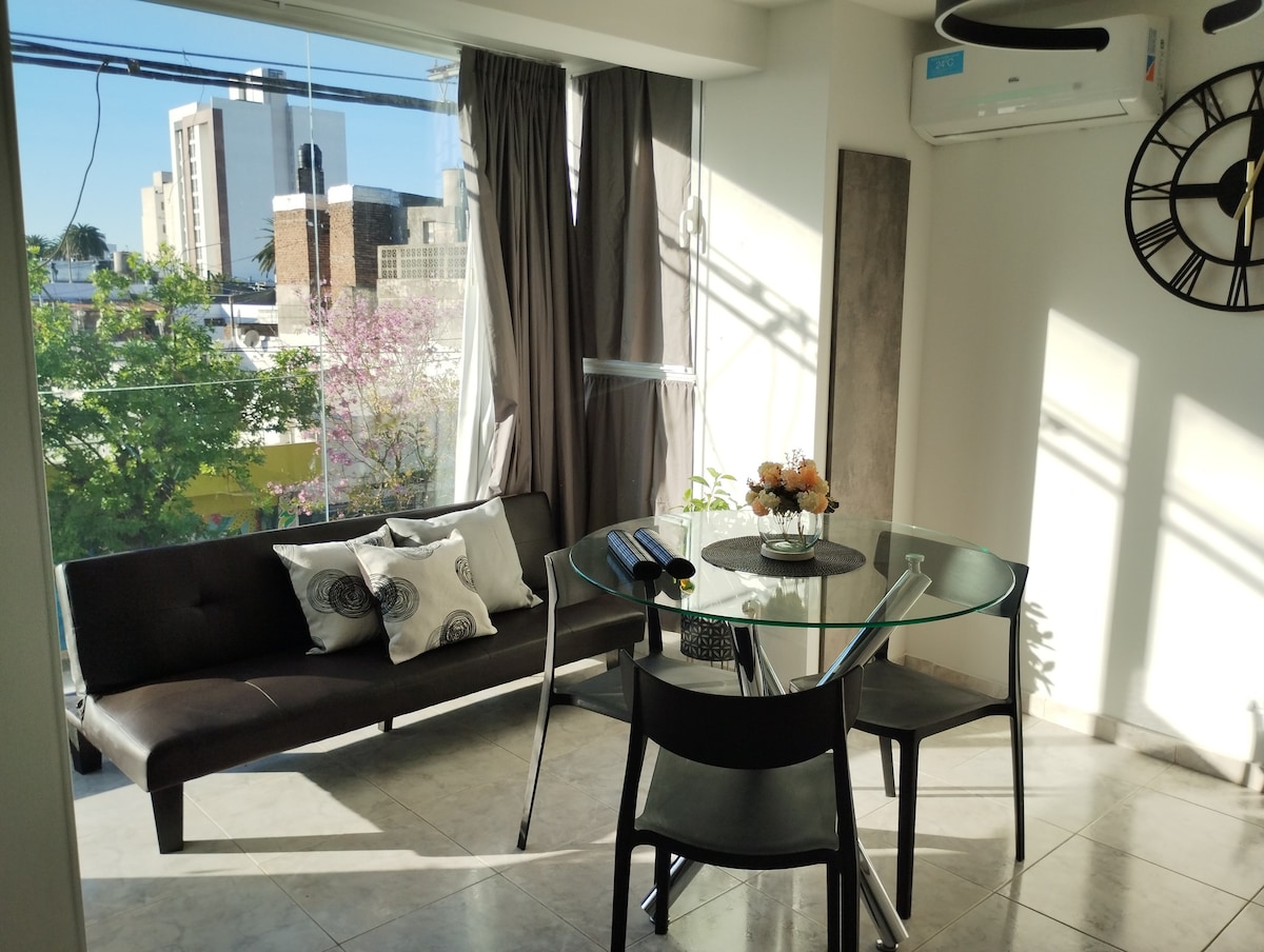 Este alojamiento es un espacio con estilo de mucha privacidad, amplio y luminoso. Completamente equipado, todos los servicios incluidos, calefacción central, aire acondicionado en todos los ambientes, dos patios de luz. El edificio cuenta con ascensor y cochera techada en el mismo edificio Brindamos servicio de limpieza, ropa de blanco, conexión wifi y TV smart en la habitación y el living comedor Se encuentra ubicado a 300 metros del centro de la ciudad en una zona tranquila y segura