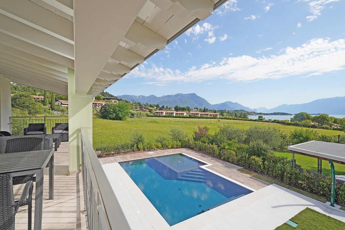 Homemade breakfast included Villa with Panoramic Lake Garda view with easy access to the beach and nearby services, 3 min. driving. Pool open --> Beginnig of spring Includes Fully served kitchen w/garden view Bright living room w/garden view Workspace&books Bathroom w/shower and tub Toiletries Hair dryer and washing machine Master bedroom Secondary bedroom for2 Sofa bed for2 Private terrace w/lake view. BBQ Parking AC Children Play area Fenced Pool w/lake view Breakfast Blankets/towels Wifi