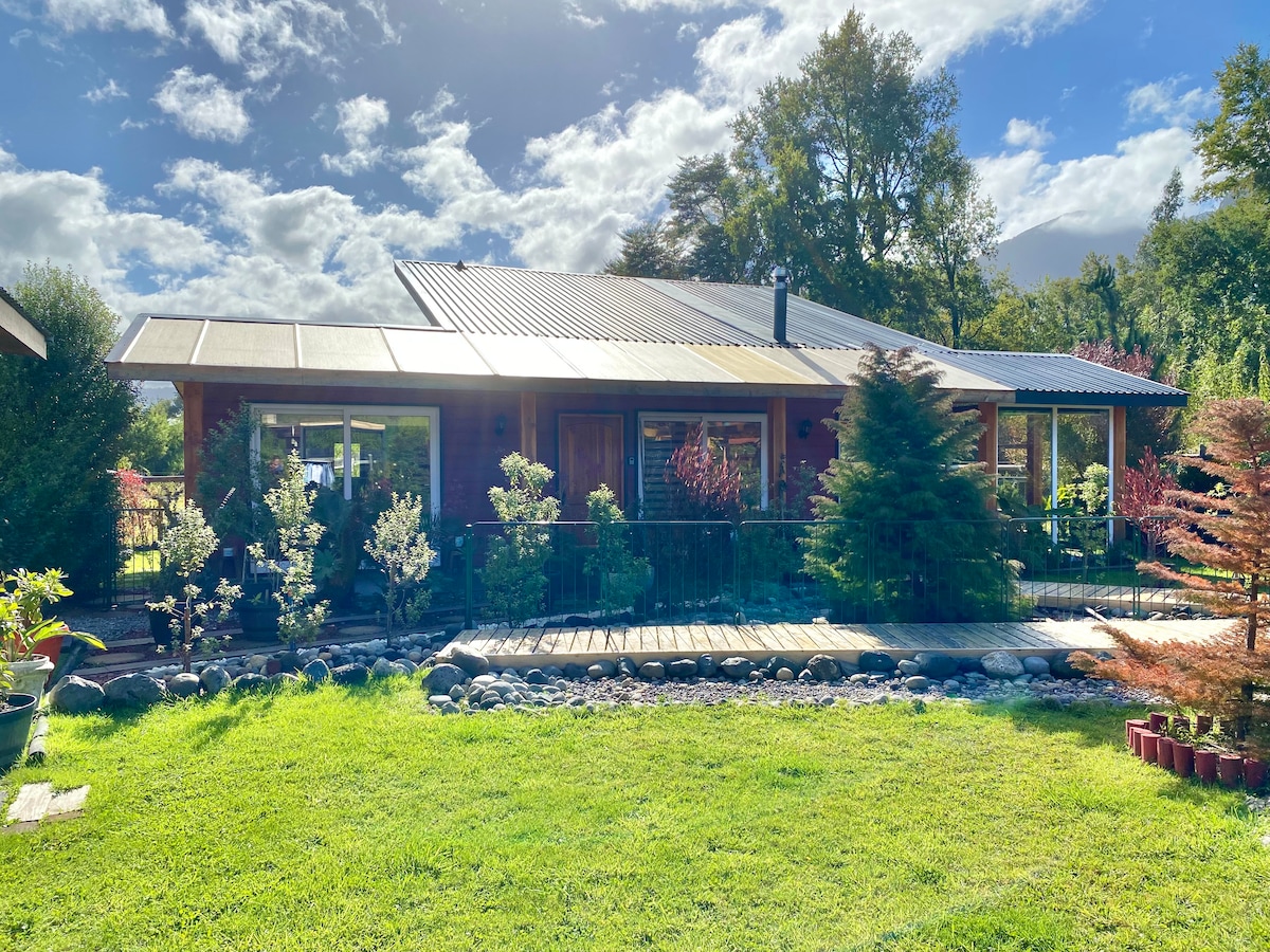 La cabaña tiene un ambiente natural y un toque rústico dentro de un entorno increíble del bosque nativo y los árboles a tu alrededor. La cabaña ha sido construida con madera nativa y sostenible. Está bien equipada. Es un espacio muy bonito y acogedor con una gran terraza con asientos al aire libre. Hay un bonito río con acceso dentro de la propiedad con una mesa de pícnic junto a él para disfrutar escuchando el río. Gran jardín verde soleado, mesa de picnic para disfrutar de las vistas a las montañas, un pozo de fuego y un par de hamacas.