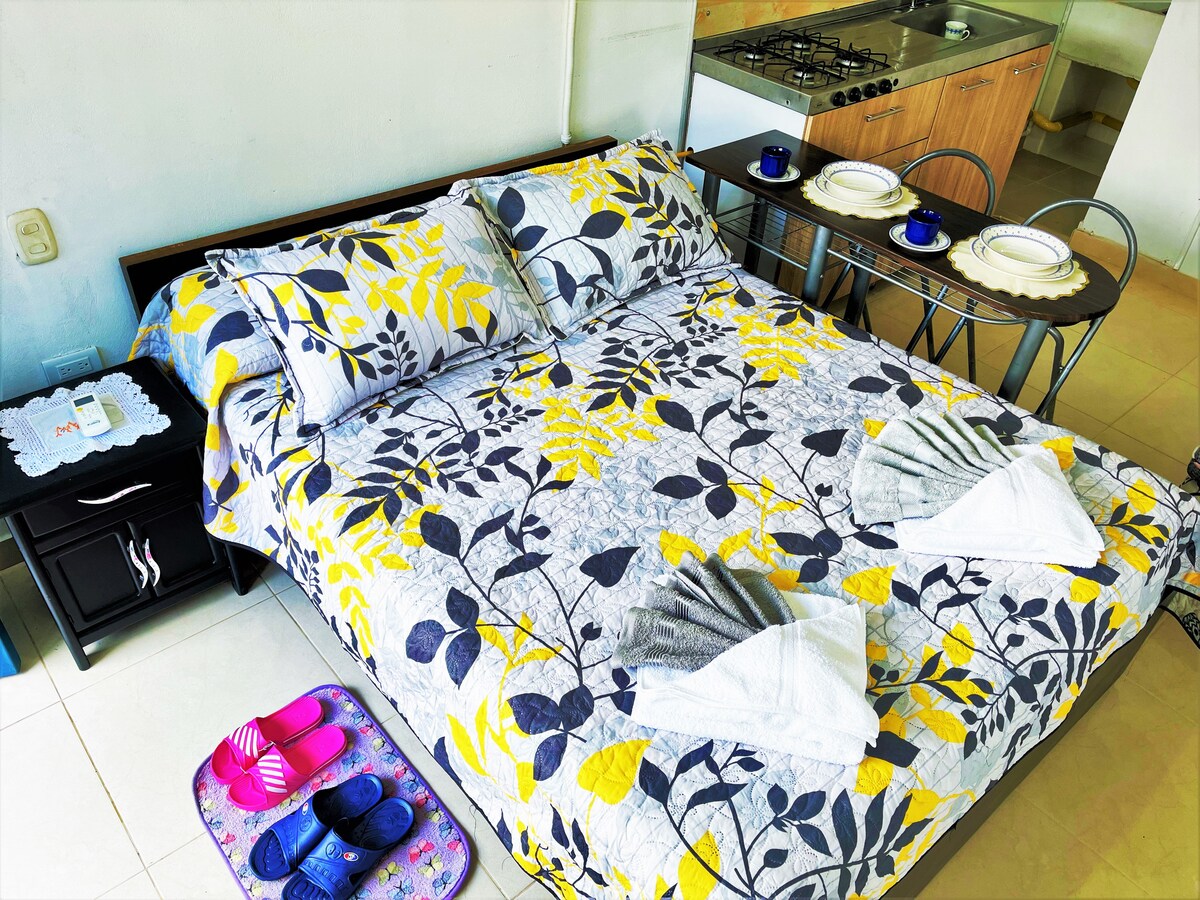 Lugar de descanso apto para dos personas, bien equipado, ideal para estancias largas. !!Ya cuenta con Aire Acondicionado!! Totalmente privado, todo en 1 solo espacio acogedor, con puerta directamente a la calle, fácil acceso. Cuenta Cocina, lavadero, Wifi, nevera, comedor, baño, suministro de agua las 24 horas (Reserva de 2.000L), en fin, lo necesario para una estancia placentera. Nota: Parqueadero gratuito!!