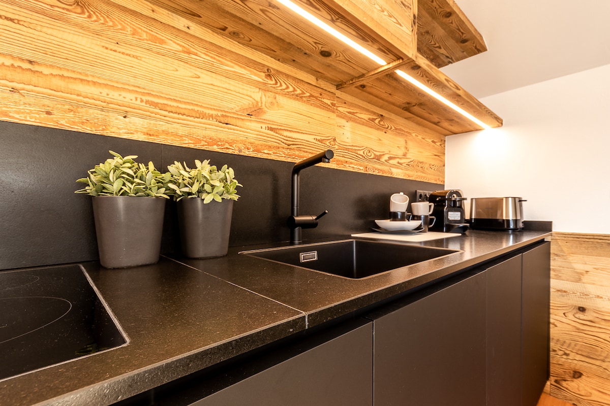 Apartamento con un dormitorio separado con vistas a las montañas o vistas al valle a los Dolomitas. Balcón o terraza con vistas a las montañas o sobre el valle a las dolomitas / sala de estar /TV LED HD/cocina de marca totalmente equipada/ un dormitorio con cama tamaño king/ baño con ducha, WC y bidé /WIFI de alta velocidad/ 32-38 m² / 1-2 personas. SPA: baño de vapor, sauna finlandesa, sauna bio, piscina de agua fría, zona de relajación, piscina de hidromasaje infinita XXL, piscina. CrossFit Box – Gimnasio.