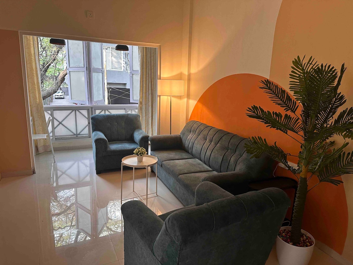 Welcome to our brand-new, spacious 2-BHK apartment, ideal for families and couples seeking comfort and convenience. The bedrooms have queen size beds with orthopedic mattresses and AC for a restful night's sleep. Relax in the large living room with a 43-inch Smart TV, lightning-fast WiFi and a dedicated dining area. Comes with two super clean bathrooms stocked with bath essentials. The fully equipped kitchen includes high-quality appliances and crockery for your culinary adventures!