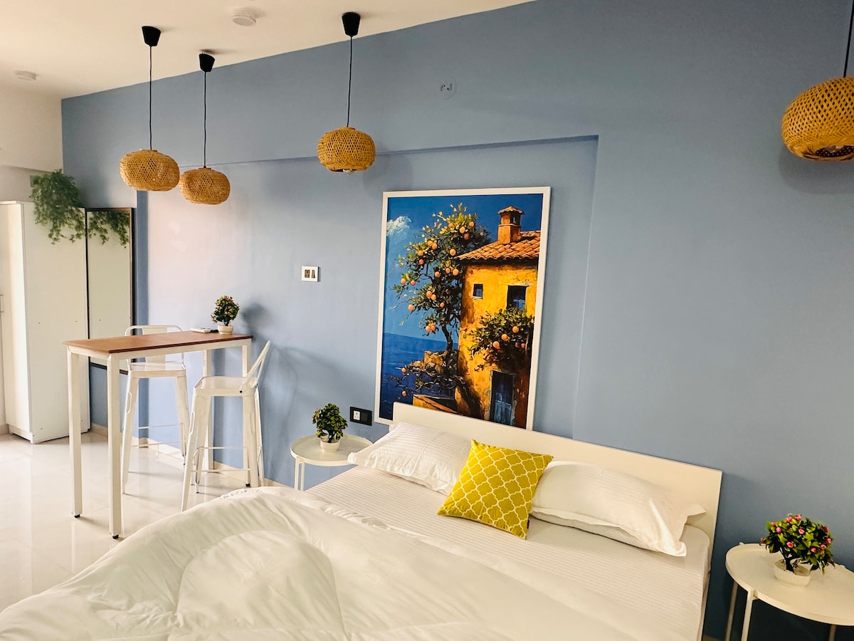 • Cómoda sala de estar: decoración moderna con una lujosa cama tamaño queen, un sofá y un rincón para comer. • Cocina totalmente equipada: perfecta para cocinar o disfrutar de un café por la mañana. • Servicios: wifi de alta velocidad, TV de pantalla plana y aire acondicionado. • Ubicación privilegiada: cerca del transporte público, tiendas y una vibrante vida nocturna. Ya sea que estés explorando las atracciones de Pune, saboreando la cocina local o simplemente relajándote, este estudio tiene todo lo que necesitas para una estancia inolvidable. ¡Reserva ahora para disfrutar de una escapada perfecta!