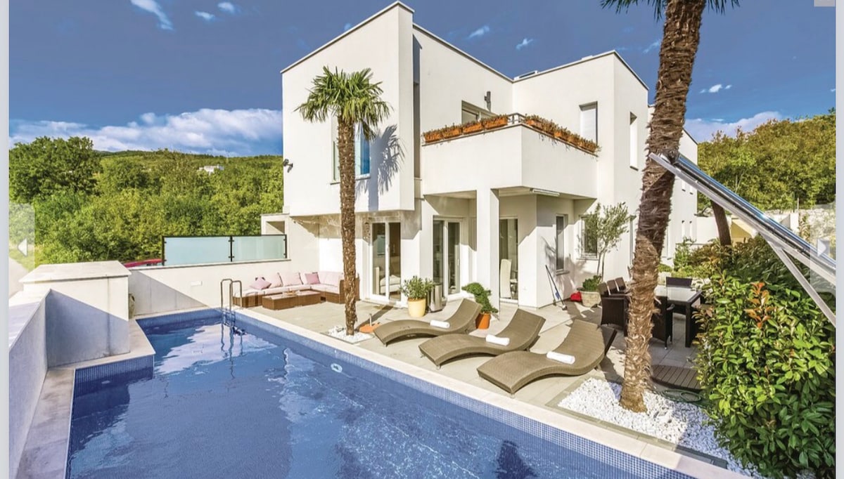 Escape to a private luxury villa surrounded by nature just 5 minutes from Crikvenica. Enjoy a heated pool, outdoor jacuzzi, wine corner and a peaceful garden. Perfect for families or friends looking for privacy near the Adriatic coast. With 4 bedrooms, the villa comfortably accommodates up to 8 guests. Outside, a private pool offers refreshment on hot days and can be heated on request for an additional fee. The sun-lounger area stays shaded most of the day and offers beautiful landscape views.