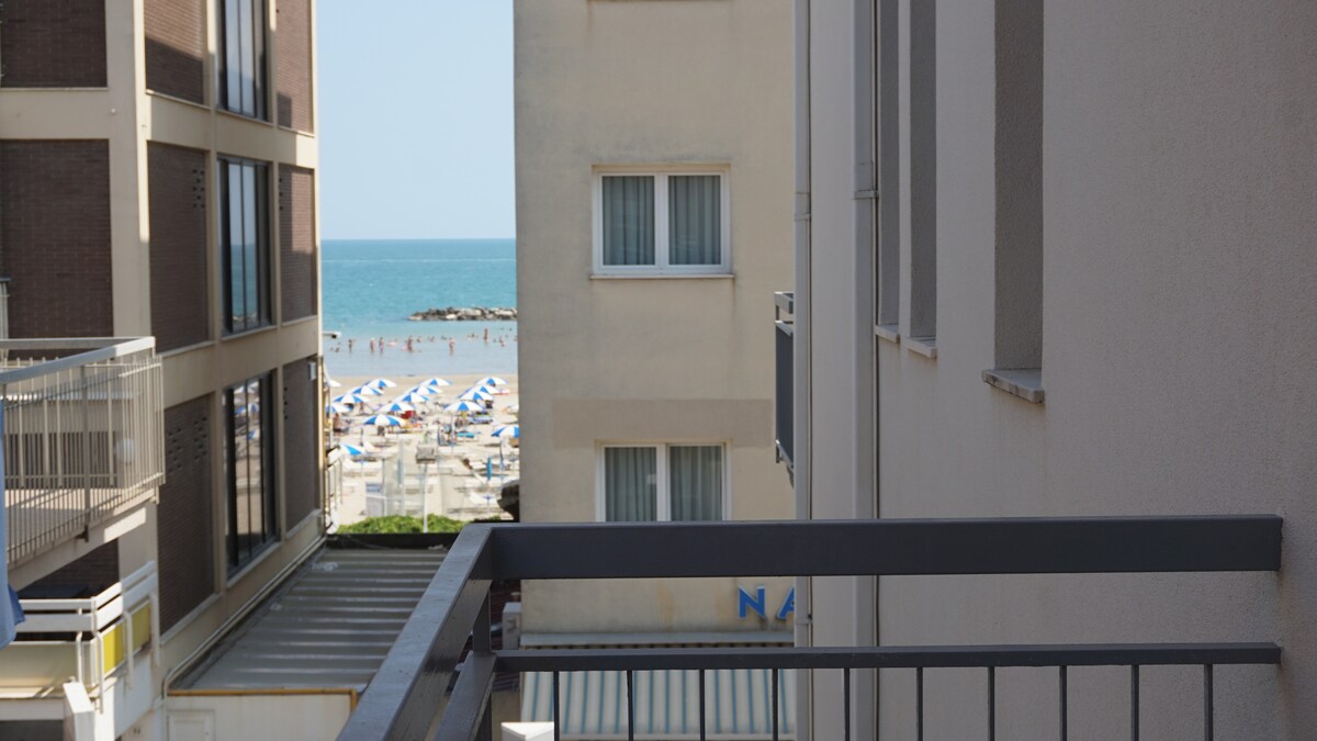 Luminoso estudio frente al mar en Viserba, con vistas al mar y a la playa a un paso, para disfrutar de la arena y del mar en un instante. Acogedora y funcional, cuenta con una cama doble francesa, un sofá cama, cocina con placa de inducción, comedor y baño privado. Dos terrazas, una de ellas con vista al mar, ofrecen espacios perfectos para desayunar, tomar un aperitivo o disfrutar de momentos de relajación. Ideal para parejas, dos adultos con un niño o viajeros de negocios.