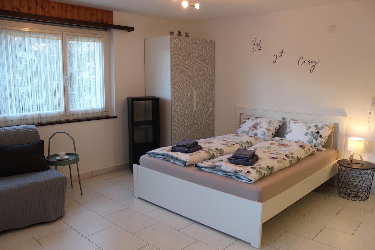 Das Studio für 1-4 Gäste, befindet sich im Erdgeschoss meines Hauses (separater Eingang). Es verfügt über ein Schlafzimmer mit Doppelbett (1.6m) und einem Sofabett (140/200). Die Küche ist gut ausgestattet und in einem separaten Raum. Auch verfügt es über einen Esstisch und einem geräumigen Bad mit Dusche. In der ganzen Wohnung hat es Fussbodenheizung.
