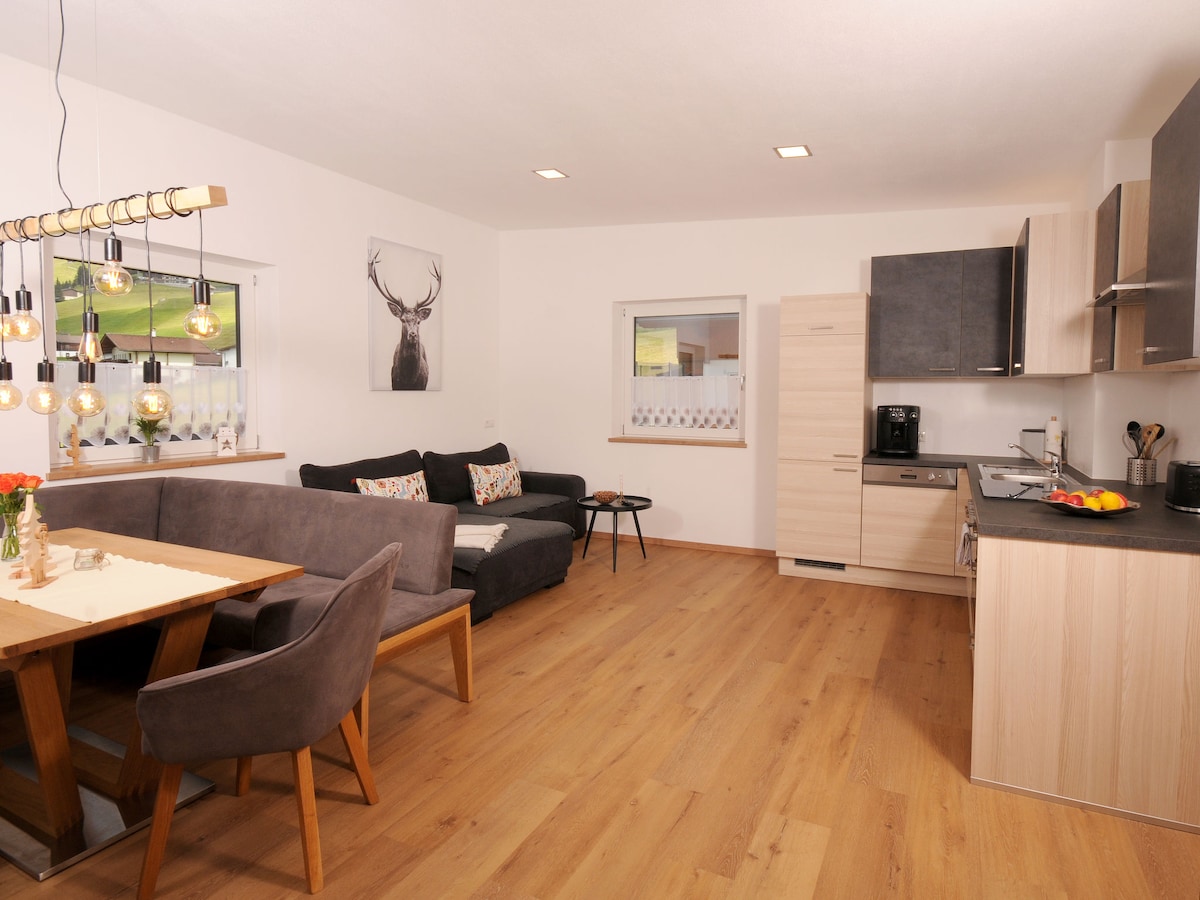 Situated on the outskirts of a Tyrolian mountain village this place offers you a wonderful-broad view. The apartment, lovingly combining tradition and modernity will let you calm down and recharge your batteries instantly. A closeby cable car enables you to all kinds of mountain sports in summer and winter. Yet- even those, who just "stay and relax" will feel at home. WIFI, TV, BT-boxes, parking space are available free of charge; for the Sauna we take a small feey. Kitchen is well equipped .