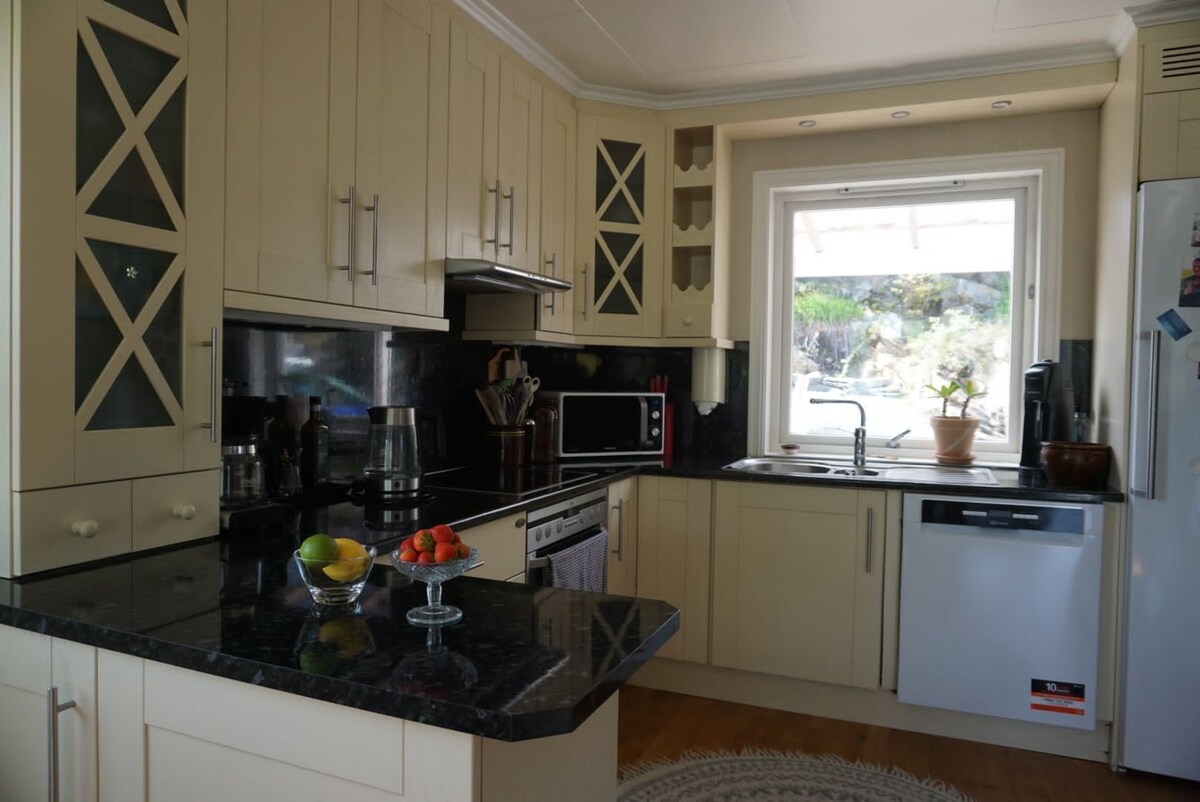 Lekker hytte med spektakulær sjøutsikt, 20 m fra sjø, egen sandstrand, brygge og kai. Usjenert, solrikt, moderne, funkispreget. Store vindu og åpne løsninger gjør at naturen og lyset smyger seg inn fra alle himmelretninger. Eikeparkett og fliser. Innlagt vann fra eget borrehull. Stor terrasse, hage, plen, bærbusker og blomster. Her nytes livet. Utleies til gjester med gjennomførte flere airbnb opphold, og snitt-vurdering 5.0. Fortell gjerne kort om deg selv. Inventar kan avvike fra foto.