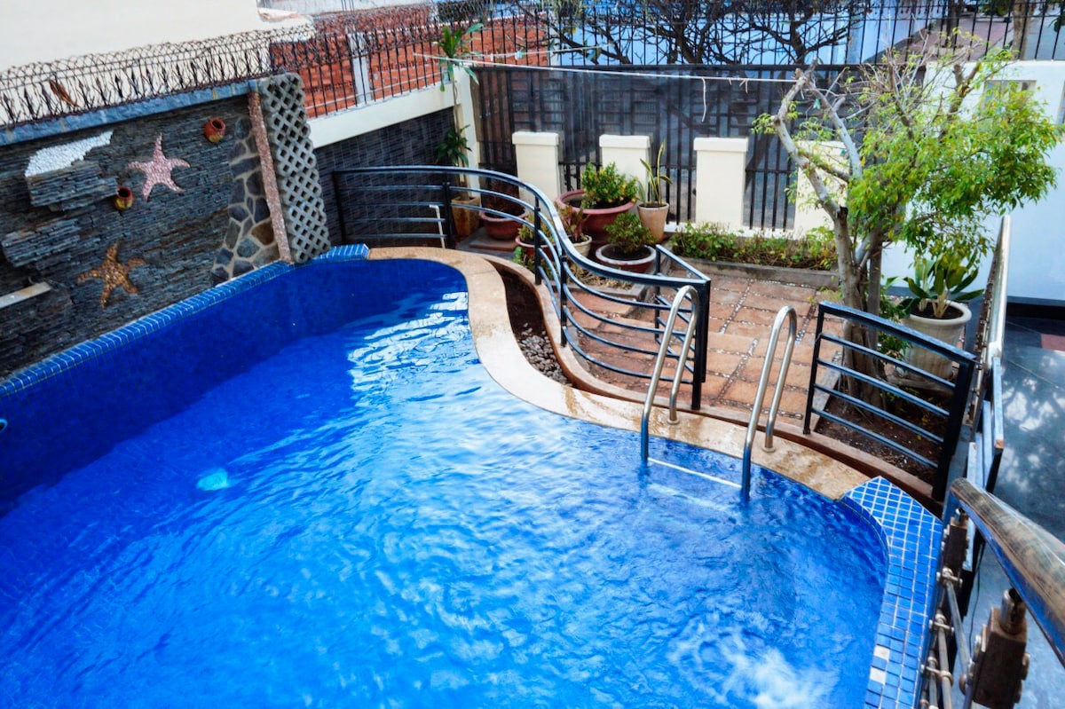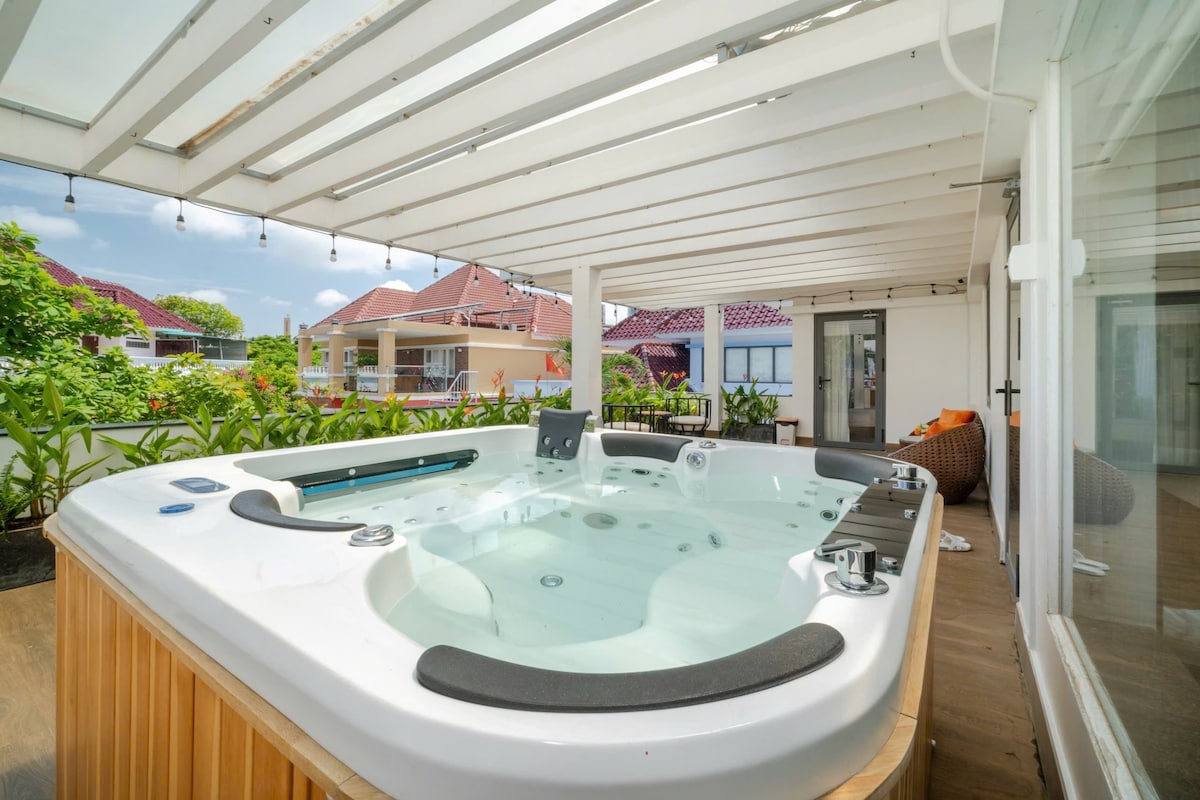 Peaceful 6-bedroom villa in Doi Ngoc Tuoc, just a short walk to Tam Thang Tower and about 350m from the beach. Enjoy a 50m² private pool, free karaoke, sauna and billiards free. The house has 10 large beds plus 4 extra mattresses, 5 ensuite bedrooms and 1 room using the shared bathroom, plus a rooftop jacuzzi. Bright living–dining area, garage and full kitchen make it ideal for family and group getaways . Set in a quiet residential area, it offers a relaxing vibe after a day