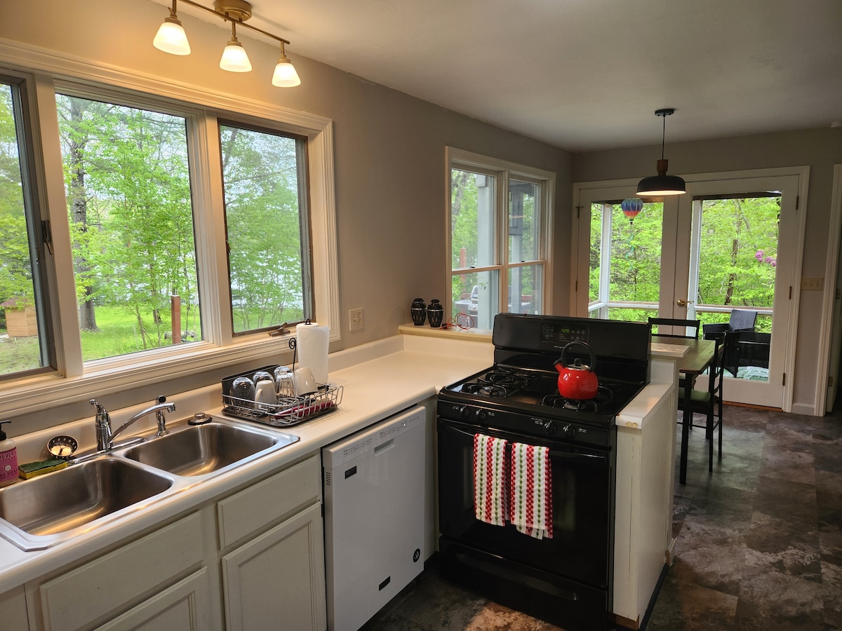 Esta casa de campo familiar, renovada con buen gusto, con muelle privado en el lago Damariscotta, fue construida para el disfrute de los huéspedes durante todo el año. Ubicado en una tranquila cala con castores residentes, peepers de primavera, ranas toro de finales de verano y visitas frecuentes de águilas calvas, águilas pescadoras, búhos y colimbos, este es un refugio fenomenal para los amantes de la naturaleza y los pescadores. El plano de planta de dos niveles acomoda cómodamente a 2 familias con sus hijos (o 3 parejas) e incluye algunos lugares menos privados (¡pero totalmente dulces!) para algunos amigos adicionales.