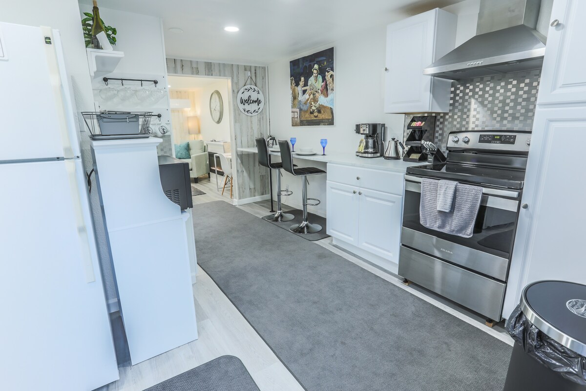 Loft luminoso y espacioso con sala de estar/comedor y cocina abiertos. Sofás grandes y cómodos situados frente a una cálida y acogedora chimenea de gas y TV inteligente. Prepara una comida en la espaciosa cocina con electrodomésticos y armarios nuevos. Todos los platos, utensilios de cocina y cubiertos son nuevos. Disfruta de café en el patio con una cafetera Keurig. Hay 2 dormitorios con camas tamaño queen y una zona de loft abierta en la parte superior de la escalera de caracol con una cama tamaño queen también. Excelente lugar para disfrutar en familia y con amigos.