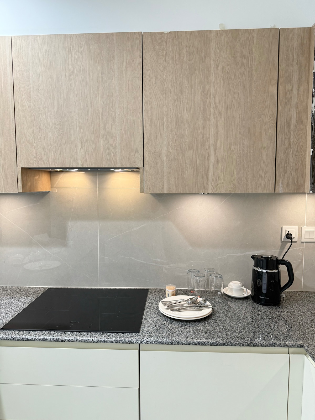 Our 1 BHK Orbit Penthouse in DHA Phase 5 is where urban chic meets celestial cool. Think: a glowing moon wall for those late-night selfies and a bold dollar-stacked art piece that screams "main character energy" Wake up to park views from your private balcony swing, binge your faves on the 50" 4K Smart TV, or cook up something aesthetic in the fully loaded designer kitchen. The interiors? Abstract, stylish, and made for the feed. Plus, you're right next to Lahore's hottest dining spots.