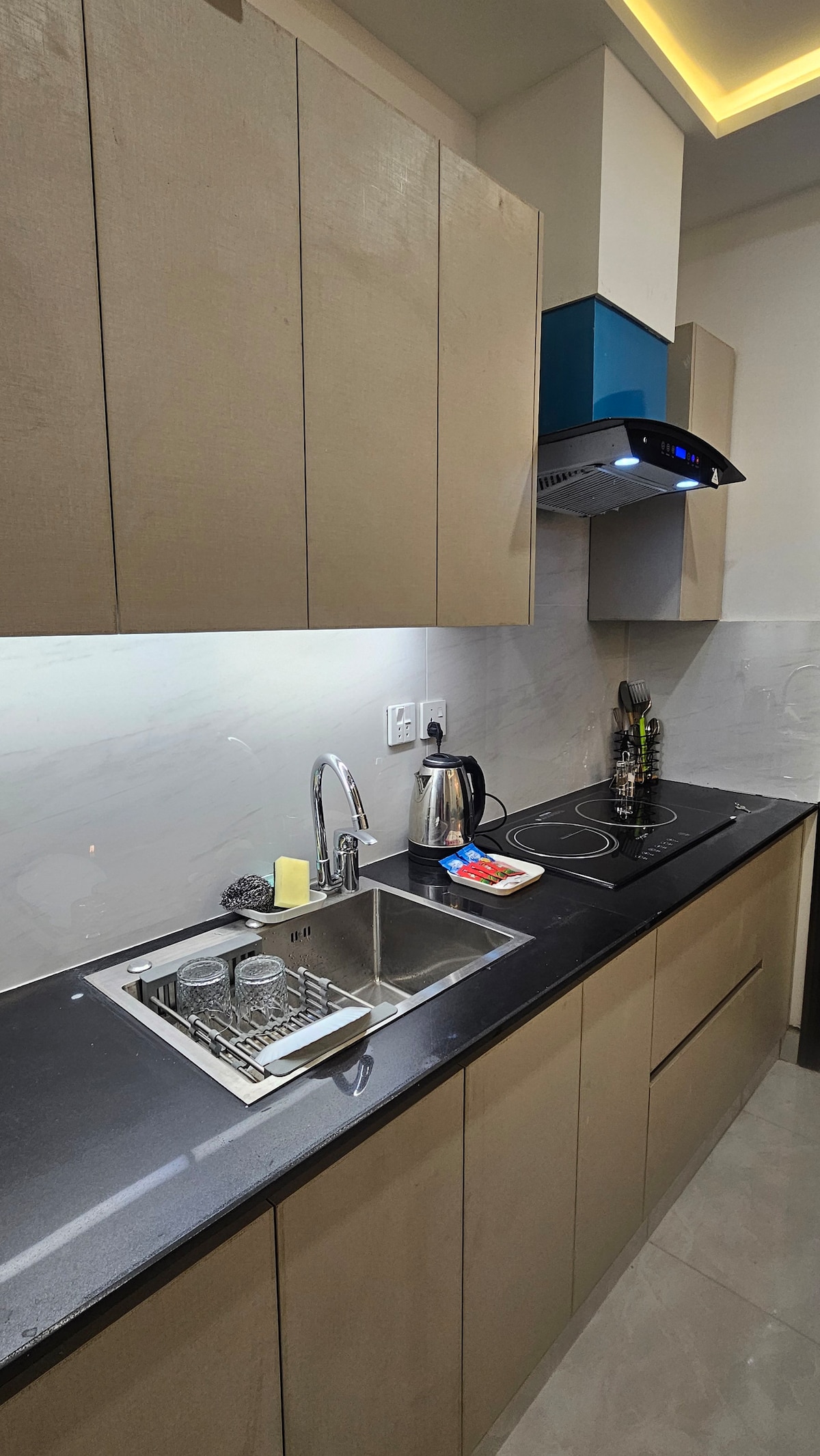 Our 1 BHK Orbit Penthouse in DHA Phase 5 is where urban chic meets celestial cool. Think: a glowing moon wall for those late-night selfies and a bold dollar-stacked art piece that screams "main character energy" Wake up to park views from your private balcony swing, binge your faves on the 50" 4K Smart TV, or cook up something aesthetic in the fully loaded designer kitchen. The interiors? Abstract, stylish, and made for the feed. Plus, you're right next to Lahore's hottest dining spots.