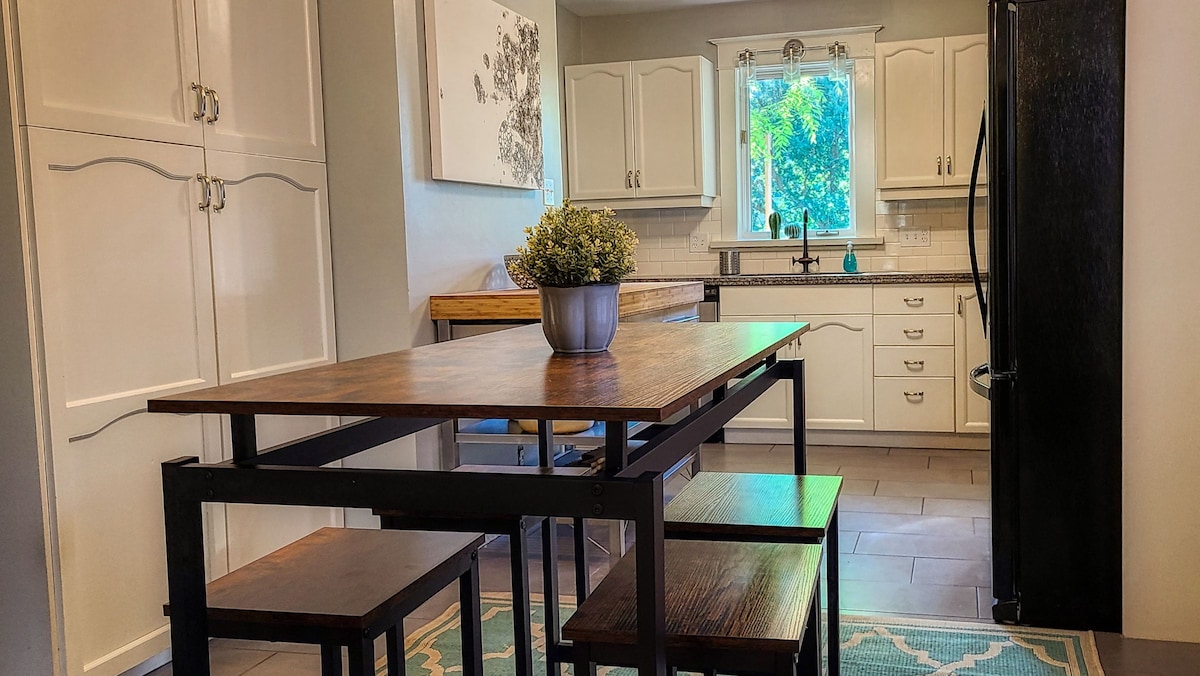 Bienvenido a nuestra lujosa suite con jardín con jacuzzi privado al aire libre, ¡perfecta para relajarse! Situada en el centro de Kitchener, está a pocos pasos de cafeterías, panaderías, restaurantes y del mercado de agricultores de fin de semana. Esta suite de 2 dormitorios y 2 baños incluye una cocina totalmente equipada, lavadora/secadora y un impresionante suelo nuevo. Con acceso rápido a las autopistas, las líneas de tránsito a colegios y universidades y el sendero Iron Horse, es el espacio ideal para familias, trabajadores y estudiantes. ¡El estacionamiento también está incluido!