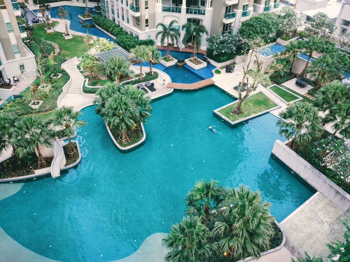 ¡Disfruta de un apartamento de gran altura como ningún otro! ¡Equipado con un increíble gimnasio y piscina infinita en la azotea! ¡Apartamento limpio y brillante con wifi de alta velocidad y varias películas de Netflix gratis! Con tiendas abiertas las 24 horas y puestos de comida que sirven comidas suntuosas hasta la medianoche, nunca pasarás hambre. ¡La estación de tren BTS se encuentra a solo 50 metros de distancia! 欢迎您来¡本公寓提供舒适的房间,房间里设备齐全 厕所,网络,软床, 位于离BTS Udomsuk轻轨站很近, BTS Udom Suk那里有菜市场,街边有卖很多的食物, 就1分钟走路到那儿, 非常地方便.
