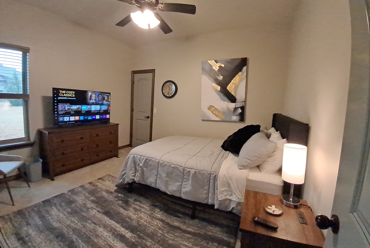 Tucked back behind the main house, this private newly remodeled studio creates a space to retire for rest and relaxation. Located less than a mile north of the University of Oklahoma campus and just a short walk to downtown Norman's restaurants and bars. This Bright and open-plan layout features a queen-size murphy bed, a sliding barn door, a kitchenette, 42 inch TV with Apple Play, and a private patio.