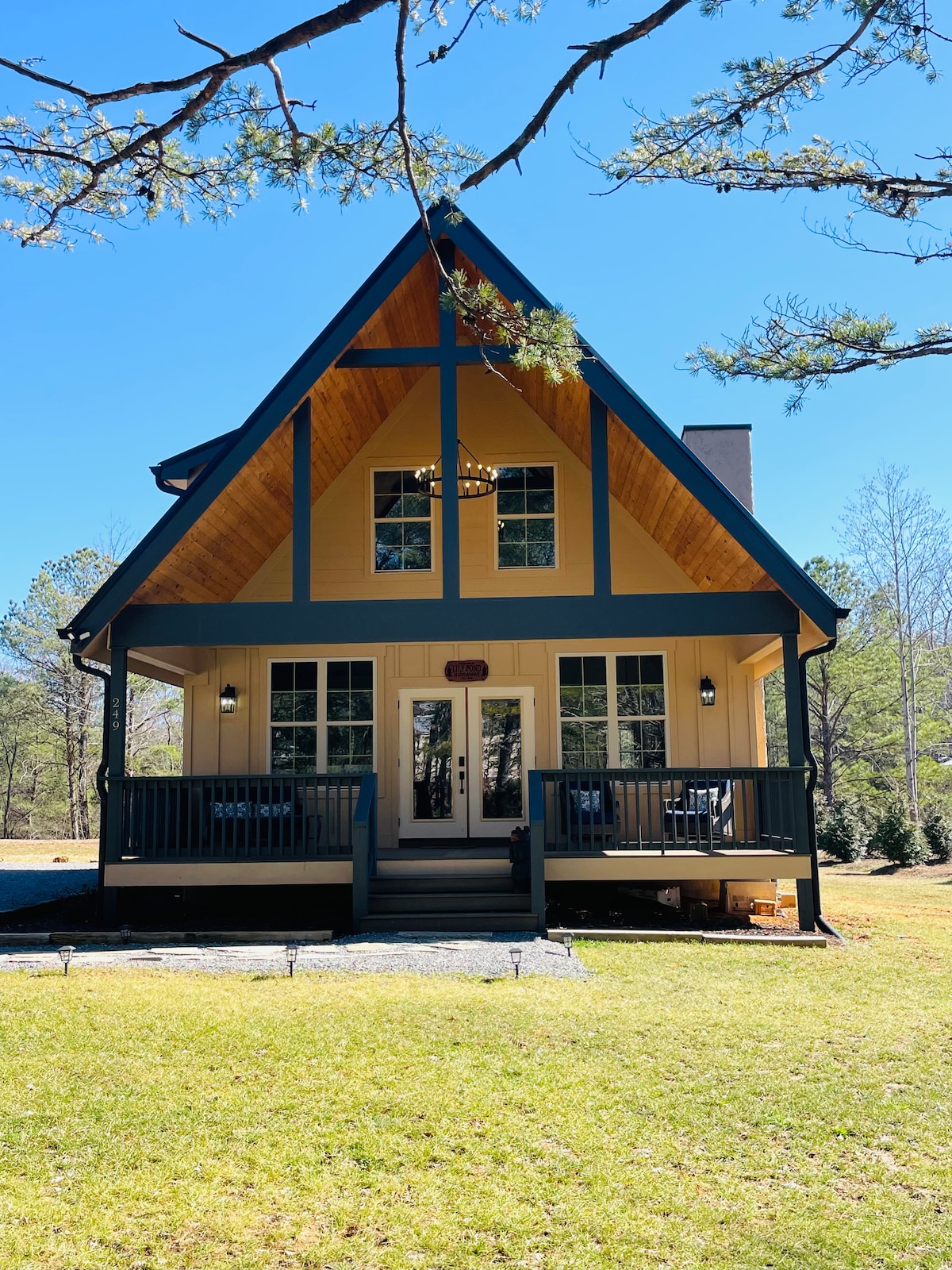 ¡NUEVA CONSTRUCCIÓN 2024! Relájate con toda la familia en esta tranquila cabaña escondida en el bosque con vistas a un estanque en el porche delantero. La cabaña ofrece dos dormitorios. El dormitorio principal de la planta baja tiene una cama tamaño queen y un baño. El dormitorio grande de arriba tiene una cama tamaño queen y literas que tienen una cama doble y una cama individual. La sala de estar/cocina de concepto abierto tiene una sala de estar con mesa de comedor. El techo abovedado cubre un loft para ver la televisión, jugar y relajarse. (La cabaña está a 8 minutos de Covenant College).