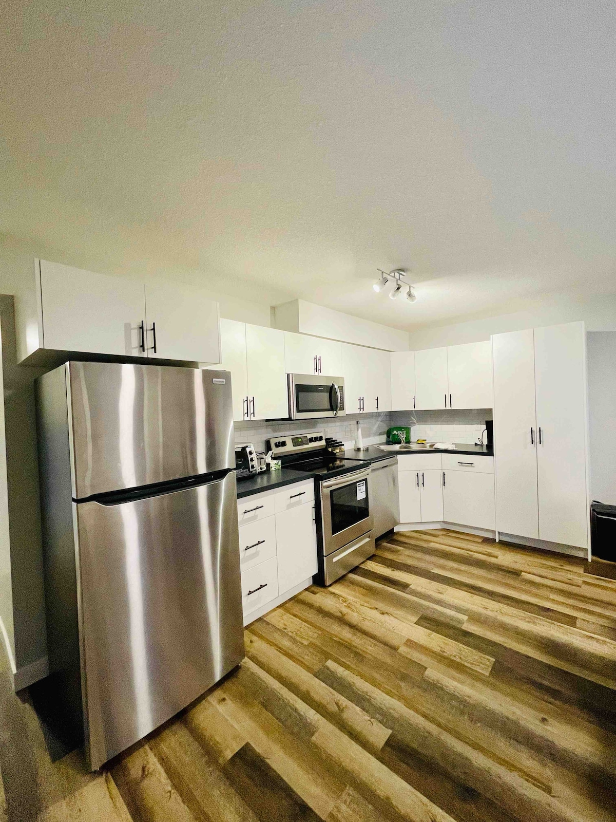 Elegante suite de 2 dormitorios en el sótano diseñada para estancias cortas o largas en un barrio tranquilo cerca del centro comercial West Edmonton Mall, River Cree Resort & Casino, Costco y los principales centros comerciales. El espacio - Salón acogedor - Camas tamaño queen y matrimoniales - Cocina totalmente equipada. - Baño completo. - TV inteligente con Netflix y otros servicios de streaming - Wifi rápido. Prestaciones - Lavandería en la suite (más de 2 noches) - Llegada autónoma sin llave Aparcamiento y normas - Estacionamiento gratuito en la calle. - No se admiten mascotas ni se permite fumar - Vigilancia exterior