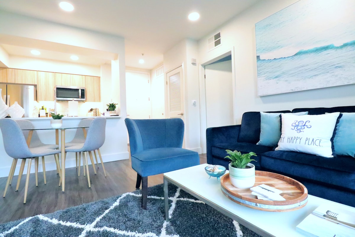 Enjoy a modern 1-bedroom apartment near the beach 🌊 with contemporary furnishings 🏡, a queen bed 💑, and a fully equipped kitchen 🍳. Amenities include high-speed Wi-Fi 📶, a smart TV 📺, in-building laundry 🛠️, and secure parking 🚗. Close to dining 🍽️, shopping 🛒, and coastal attractions 🏖️, it's the perfect blend of comfort and convenience.