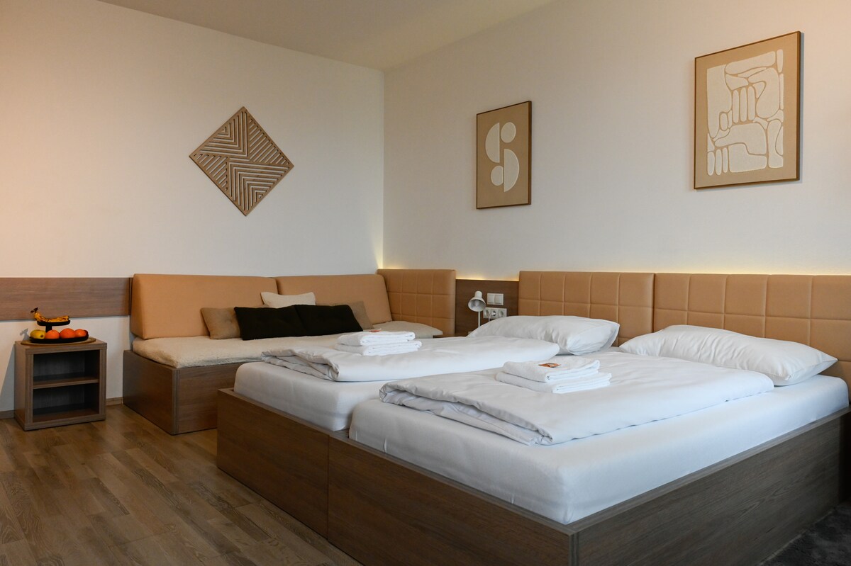 The apartment has two separate bedroom area and a linving room. All apartment has a balcony, include a seating area, a flat-screen TV with cable channels, an equipped kitchen, a dining area, and a private bathroom with a sauna. The kitchen features a hot plate, oven, dishwasher, and a fridge, as well as a kettle and a coffee machine. The accommodation charges 12€ as cleaning fee for every booking, which is not included in the price.artment.