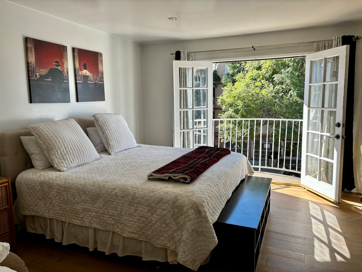 Tranquilo y cómodo apartamento de 1 dormitorio con baño privado, sala de estar, cocina y balcón privado. Mi gatito MauMau vive aquí. Tiene aproximadamente 7 años. Por favor, no me pidas que saque a mi gato. Es una rescatada y este es su apartamento. Iré 2 veces al día para cuidarla. Respetaré tu privacidad, pero por favor entiende que pasaré. A 1 manzana de Santa Mónica para estancias cortas o largas. Ventiladores, calefacción, wifi, lavadora/secadora de monedas en el edificio, fácil acceso a la ciudad y la playa.