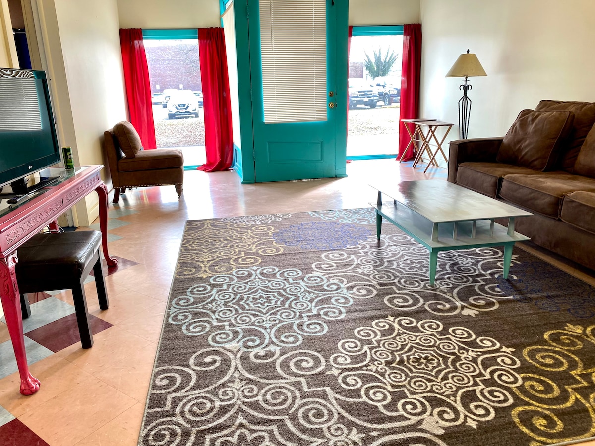 Estás a poca distancia a pie del distrito histórico del centro, donde encontrarás comida y tiendas. Puedes ir caminando al Backhome Festival, RegattaFest, Vintage Regatta y otros eventos de Main Street. Este apartamento era un edificio comercial convertido en un apartamento. La ducha de pie es pequeña. La cocina tiene una estufa de tamaño completo y una nevera. Hay una gran mesa de acero inoxidable para preparar comida. Hay un fregadero grande para lavar los platos y no hay lavavajillas.