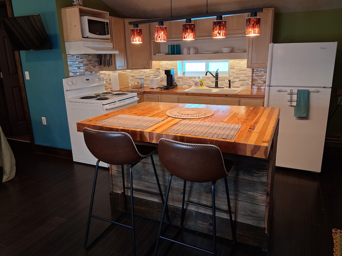 Feel at home and relax from your travels in our unique and peaceful efficiency. One block from the iconic Route 66 and within walking distance to the famous U Drop Inn, featured in the Cars movie. Cabin M features a full kitchen with coffee and cookware, full bath, as well as a queen size bed. The large closet has plenty of space for hanging clothes, with iron and board. Large 55 inch TV with Roku in seating area, and 32 inch with built-in DVD player for watching in bed. Free Wi-Fi.