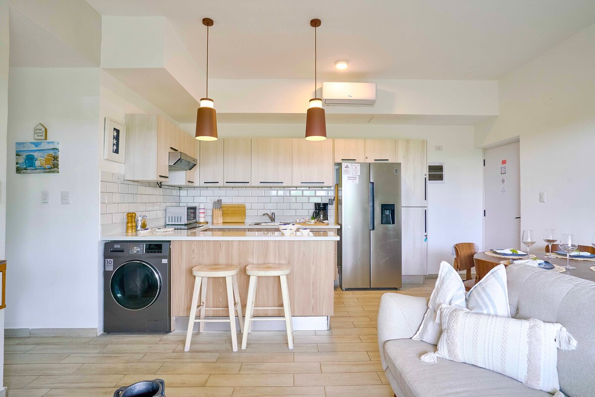 Este elegante apartamento ofrece dos habitaciones amplias, cada una con su propio baño privado, garantizando privacidad y confort para cada huésped. La cocina moderna y completamente equipada es perfecta para preparar deliciosas comidas, mientras el comedor invita a compartir momentos memorables. Disfruta del balcón privado, ideal para relajarte y disfrutar del clima tropical. Además, el complejo cuenta con una espectacular piscina para refrescarte y un gimnasio equipado para mantenerte activo.