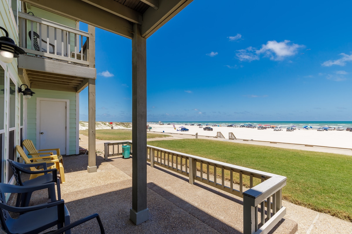 Quiet corner unit w/water and sunset views from large private balcony. 2nd floor unit with no one above. 2 bdrm/1 bath with 2 king beds, 1 queen bed & porta crib. Semi-private entrance w/only 3 other units. Well-lit and secure. Close parking. Only steps from the pool and the bar bq pavilion. Private walkway to the beach & seawall. Walking distance to Brewster Street Ice House w/live music. A great place to get away, relax & make memories with your loved ones. Winter Texans welcome.