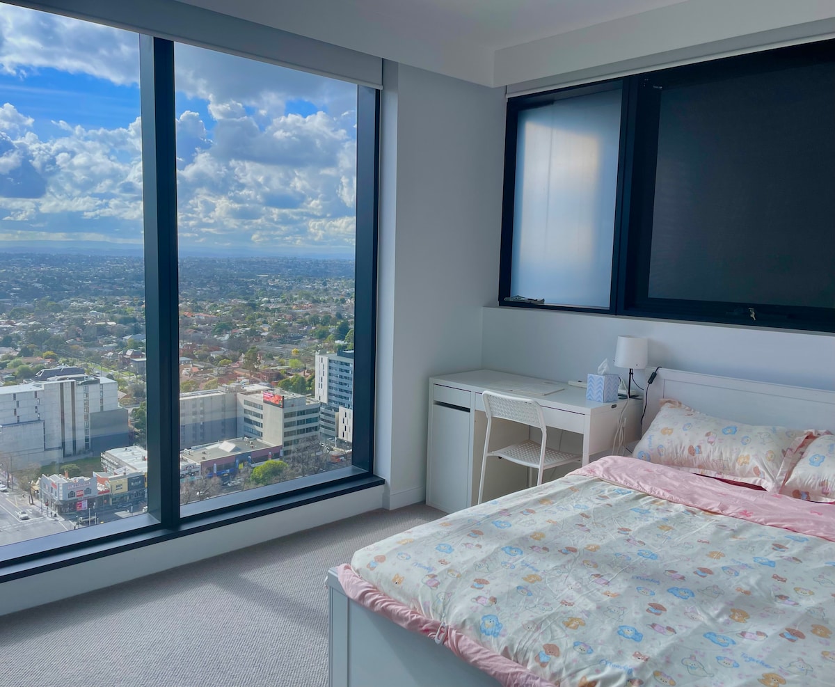 Esta es una de las habitaciones del departamento. Estarás solo con una ventana del piso al techo con el amanecer y un armario del piso al techo con su propio espejo.Junto a la habitación está tu baño separado, no es necesario compartirlo con nadie. Con ventanas de piso a techo de 270 grados en la sala de estar, puedes ver el lejano CBD además de mirar las montañas. Utilizarás las áreas comunes como la sala de estar y la cocina conmigo y mi novio y podemos ofrecerte un buen desayuno si lo necesitas🍳. Hay muchos restaurantes y supermercados en la planta baja de la casa.A 2 minutos a pie en tren, tranvía y autobuses, y el tren más rápido al centro de la ciudad de Melbourne está a 15 minutos. Tienes acceso gratuito a instalaciones como gimnasio, piscina, sauna y terraza con barbacoa en el apartamento. Estoy planeando hacer una pared fotográfica y me gustaría invitarte a dejar tus huellas en la pared de fotos también.