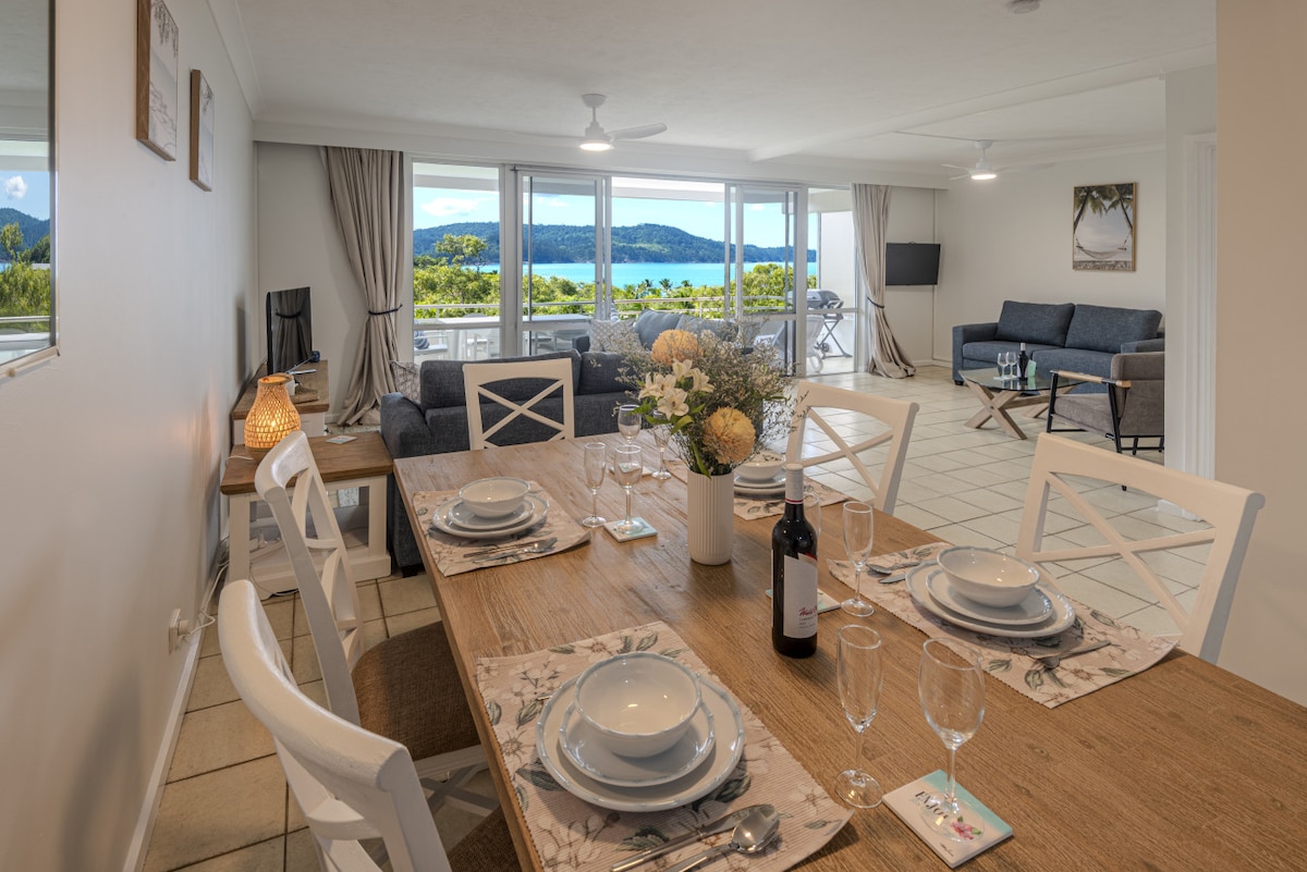 Compass Point 1 is a fully renovated (in Aug 2023) one-bedroom, top floor apartment with spectacular views of Whitsunday Passage and Henning and Whitsunday Islands. Guests will enjoy magnificent sunsets from the large balcony, complete with electric Weber BBQ and outdoor setting. Unlimited free Wi-Fi, Netflix (on both main TV and bedroom TV) and Foxtel (with sports) on main TV. Plus, the use of a 4-seat electric buggy for of your stay (note drivers need to have a standard driver's licence).