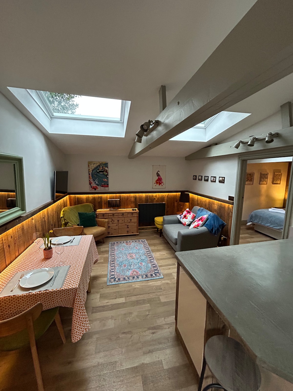 Este es un anexo independiente sobre un garaje doble (ten en cuenta los ángulos bajos del techo en algunos lugares) con una puerta independiente. Tiene una cama tamaño king con algunos asientos, un televisor y una mesa de comedor. Hay una pequeña cocina americana que incluye microondas, nevera, hervidor de agua y tostadora. El baño tiene una ducha eléctrica básica y los servicios habituales. Hay internet disponible. Si quieres traer a un niño, ponte en contacto con nosotros antes para comprobar si es adecuado. Hay aparcamiento en la carretera principal o enfrente en un cierre.
