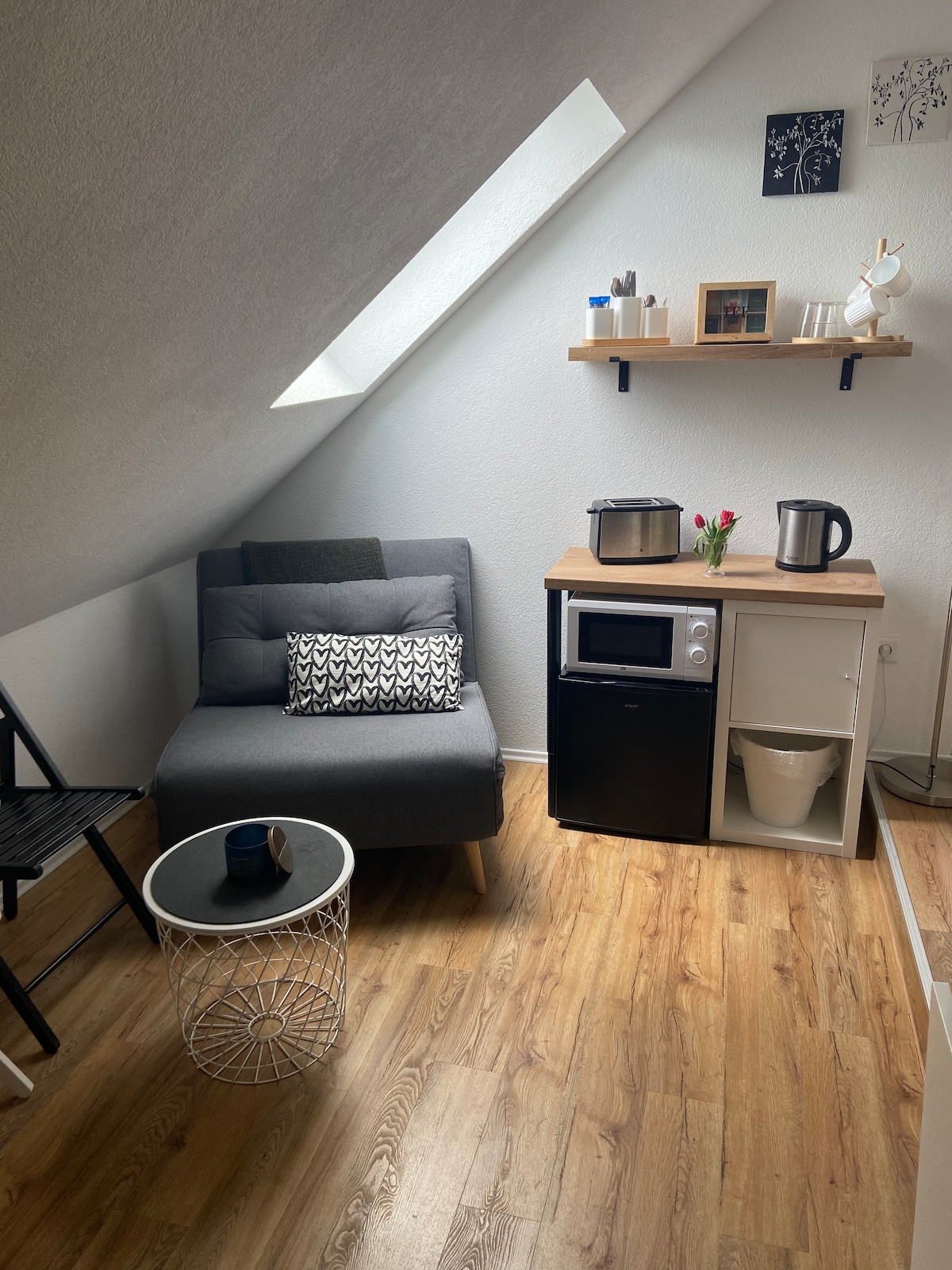 Nuestro pequeño apartamento de unos 30 metros cuadrados consta de una habitación y media con sala de estar y comedor, dormitorio separado y un pequeño baño. Se encuentra a poca distancia a pie de la estación de tren, pero aún más rápido se está en los hermosos campos. El apartamento tiene una entrada independiente, nuestra terraza delante de la casa también se puede utilizar. Probablemente, el alojamiento es más adecuado para una persona, pero también hay espacio para dos personas que se quieran :)