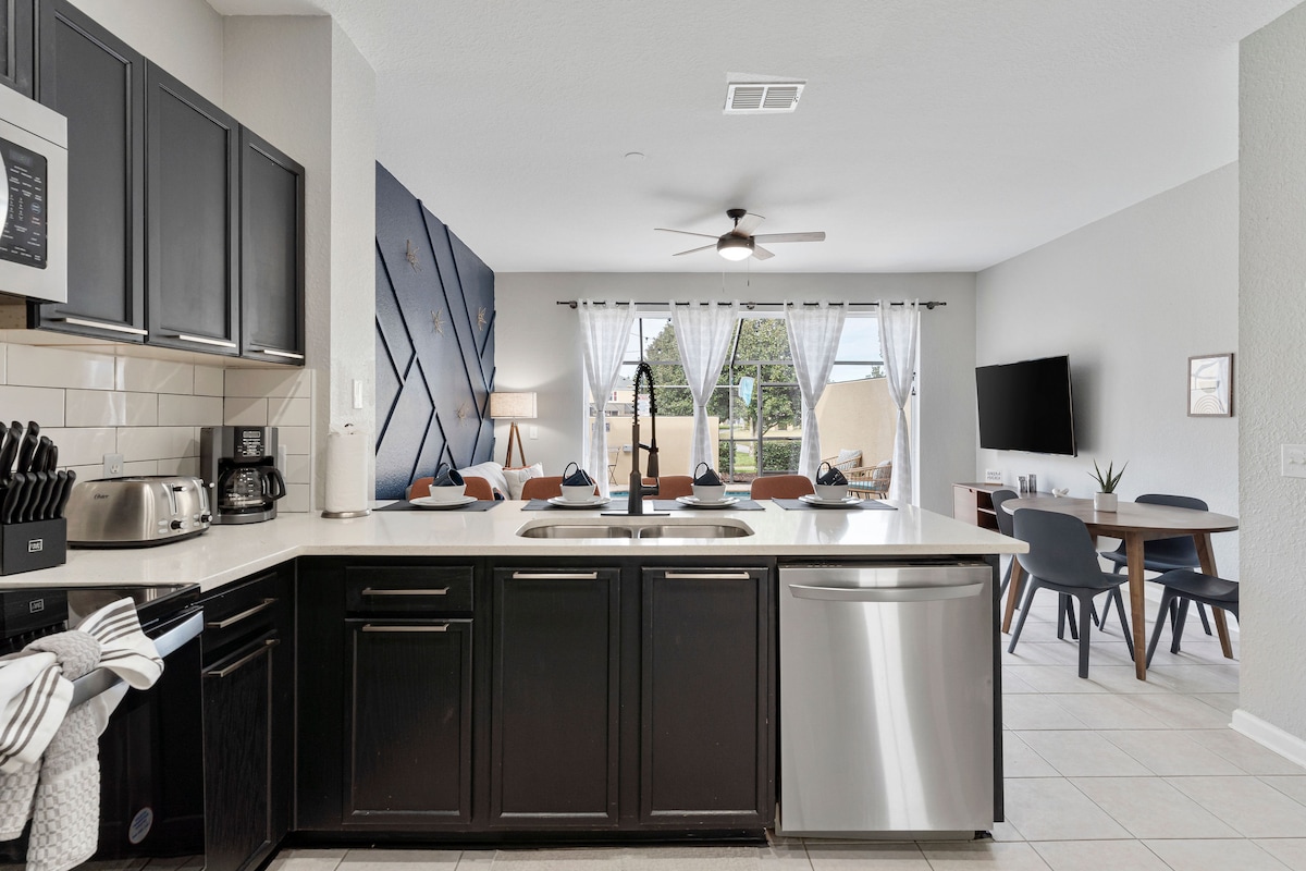 ¡Disfruta de tu estancia en esta preciosa casa recién renovada! MINUTOS de Walt Disney World. - TOBOGANES 🎢 DE AGUA • Star Wars Retreat 🌟TEMÁTICO - Cocina de🍴 entretenimiento • Cochecito 🤱 BOB Jogger disponible • 🏖️ Patio privado con PISCINA CLIMATIZADA • ☕️ **Latte y cafetería** • Wifi 📶 de alta velocidad de fibra Seleccionado cuidadosamente para que lo DISFRUTES al máximo. Hermoso interior moderno, suelos de baldosas de cerámica y decoración de alta calidad en todas partes. Esta impecable casa de 3 dormitorios y 3 baños tiene capacidad para 8 personas.
