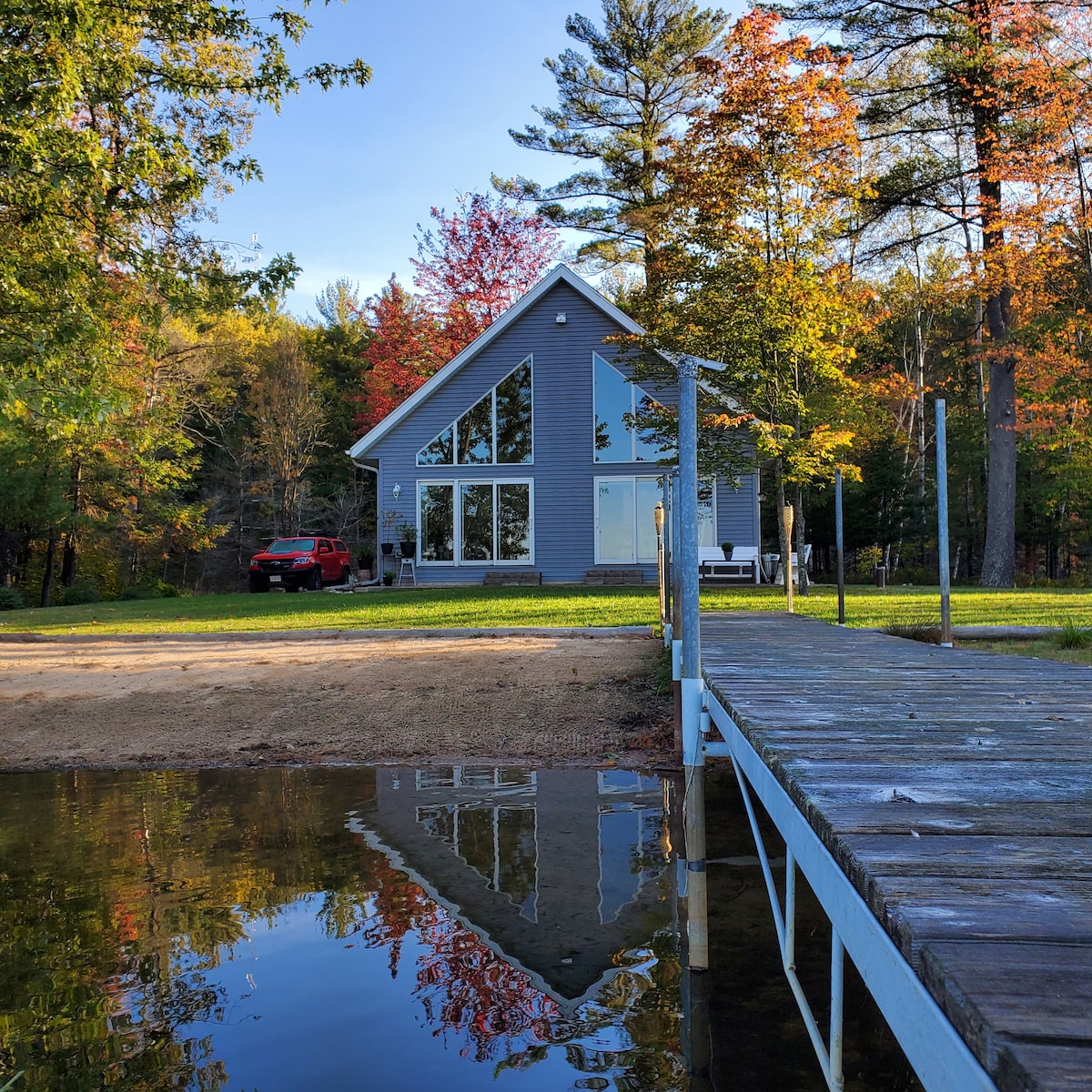 ¡Escapada familiar perfecta durante todo el año! Lujoso chalet de 3 pisos se encuentra en más de 15 acres con 770 pies de frente al lago Lucy. 2 cocinas para alojar a familias numerosas, canguro/perrera, senderos privados para caminar, fondo de arena del lago ideal para vadear, muelle privado para pescar, aro de baloncesto, natación y kayak. En invierno hay raquetas de nieve, pesca en hielo y trineo (trae tu propio equipo) a la propiedad. Cerca de pistas de esquí de fondo/esquí y senderos móviles de nieve. Estación de carga EV (NEMA 14-50)