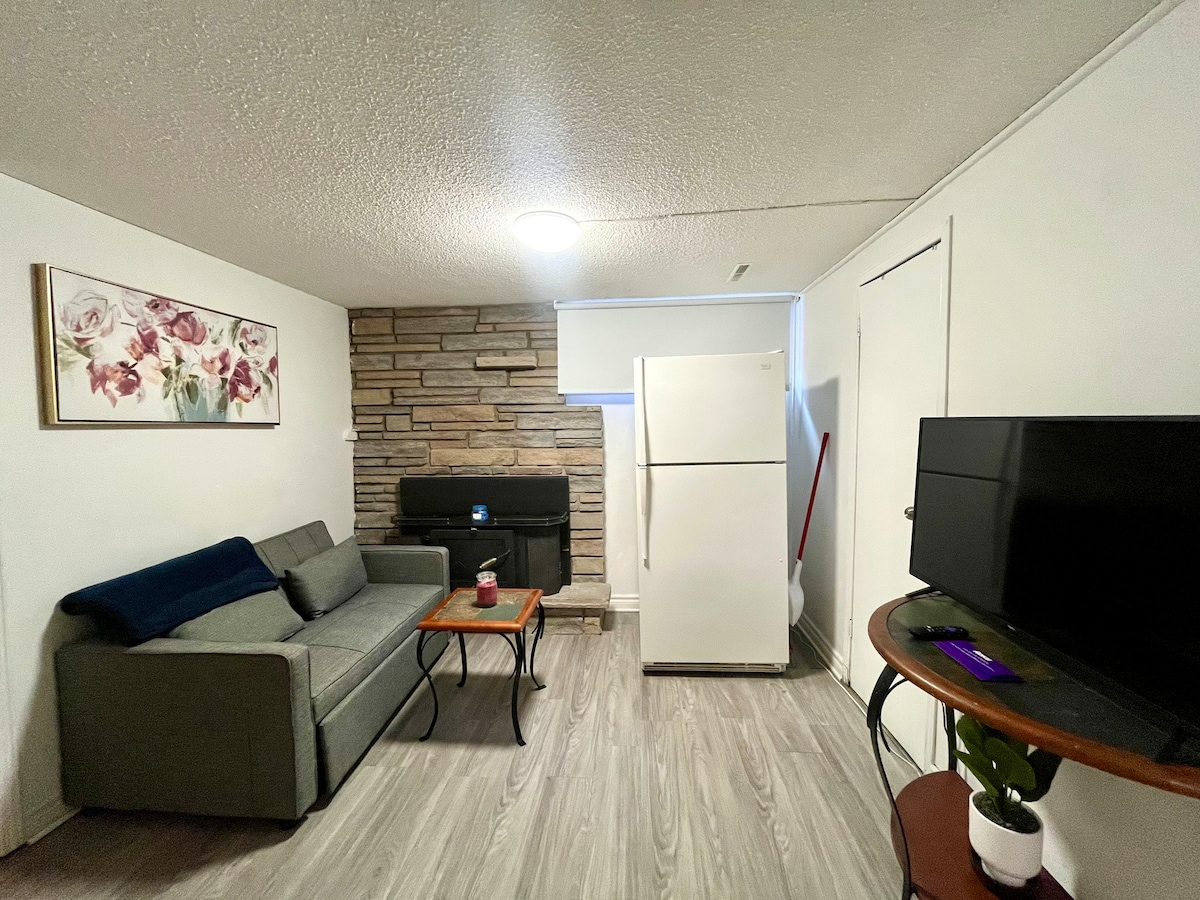 · Aparcamiento sin nieve, 1 cama, 1 baño, 1 salón, con lavandería y cocina completas, ¡frigorífico, por supuesto! Y son exclusivamente para tu uso. · Ambiente cómodo con cama tamaño queen, ambiente acogedor y entrada con teclado para garantizar tu seguridad. · Situado en un barrio tranquilo. A 1 minuto del parque forestal y del campo de carreras. · Proporciona 1 aparcamiento. A 3 minutos a pie de las paradas de autobús. A 10 minutos en coche de la autopista 401. · Escapa del ajetreo y relájate en este pequeño apartamento sótano premium de alta privacidad.