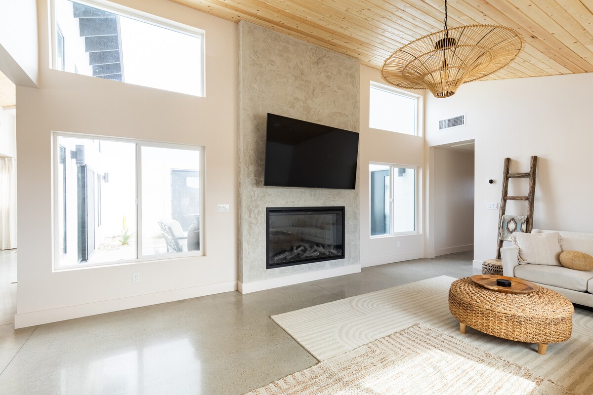 Bienvenido a Daybreak, una escapada de lujo en el desierto con servicios de alta gama y una piscina de diseño a pocos minutos del Parque Nacional Joshua Tree. Relájate en el patio trasero estilo resort con una piscina resplandeciente, spa y un garaje de entrenamiento totalmente equipado con sauna seca de infrarrojos. Repleto de juegos, opciones de fitness, áreas de descanso al aire libre y espacios relajantes para todas las edades, este refugio moderno e impecable ofrece comodidad, estilo y una escapada al desierto verdaderamente elevada más allá del típico alquiler polvoriento.