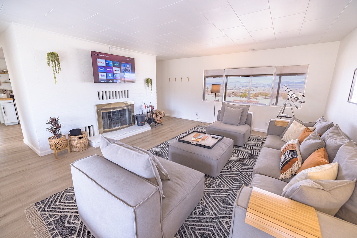Prístino y cómodo control remoto de 5 acres Wonder Valley Desert Hideway. Relájate, bebe y cena en el porche y disfruta del sereno paisaje del desierto. Deslízate en la reluciente bañera de hidromasaje para 6 personas después de un día de senderismo en el cercano Joshua Tree. Después de la cena, relájate en la zona del fogón con increíbles cielos estrellados. ¡Vistas increíbles desde cada habitación! Plano de planta abierto con suelos de madera, cocina totalmente equipada, chimenea de piedra y televisor inteligente de 43". 3 dormitorios privados con cama tamaño queen + 2 baños completos. Cerca de Nxwhere.
